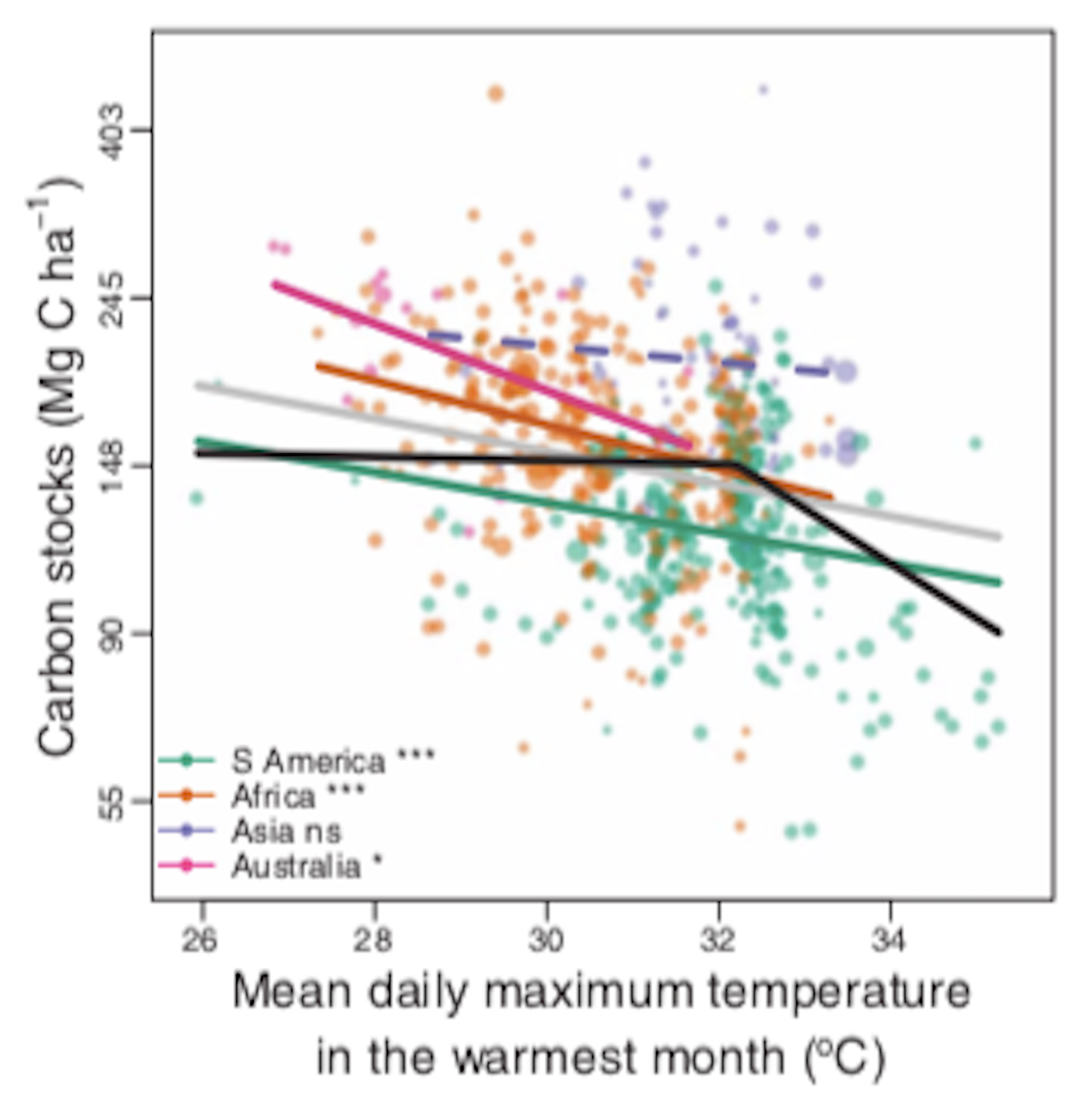 We found that tropical forests can tolerate small changes in temperatures, but only up to a point. Once annual mean daytime temperatures in the warmest part of the year hit 32˚C or more, these forests release four times as much carbon to the atmosphere per degree increase in temperature as they would below the threshold. This is mostly because hotter temperatures reduce tree growth, but it’s also down to heat combined with drought meaning trees are more likely to die and decompose, which releases carbon back into the atmosphere.