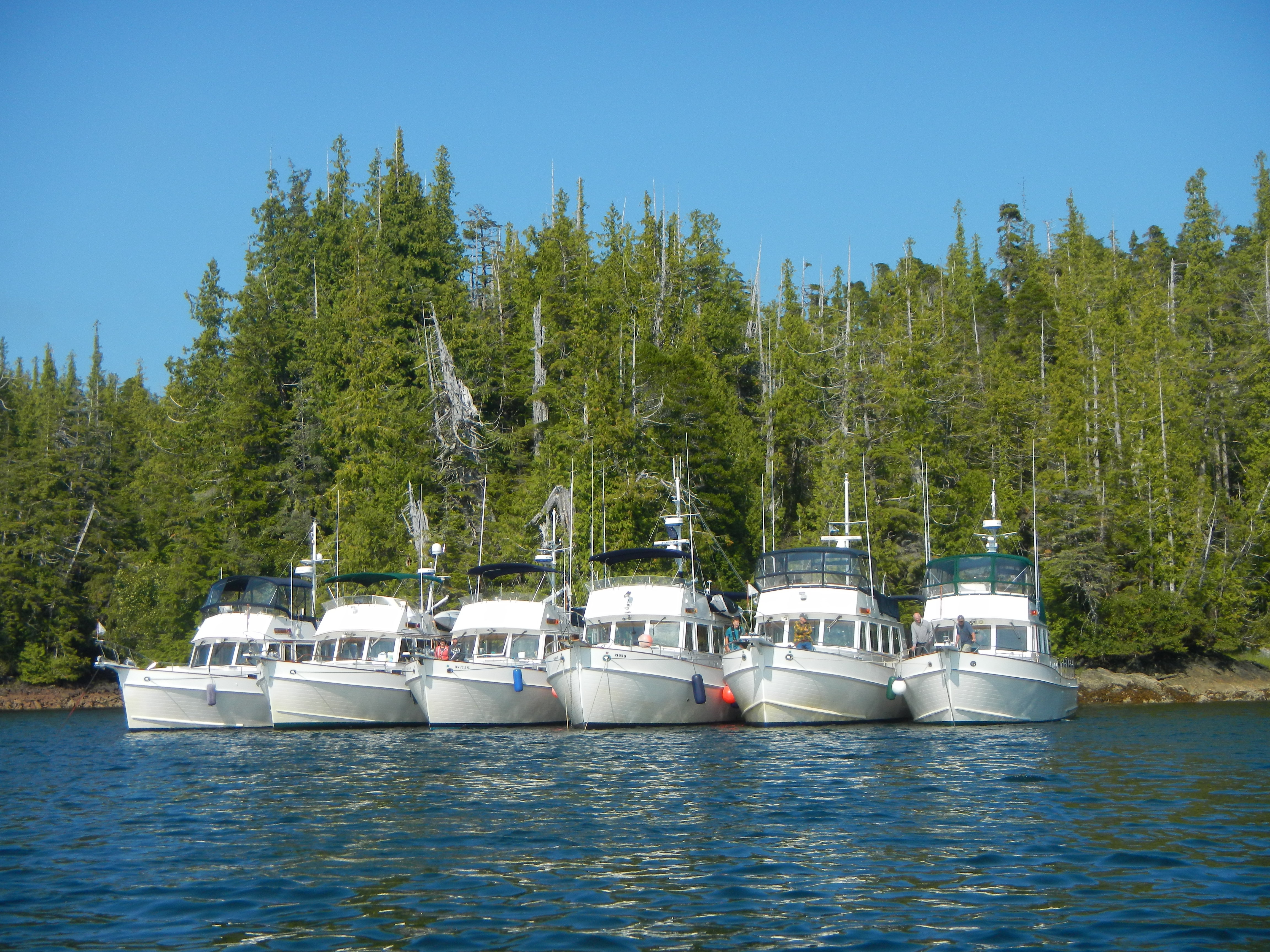 Shortly after 9 AM, the mist over Ketchikan Marina lifted. The crews of our six motor launches fired the twin diesel engines, loosened mooring lines and coordinated radios as anticipation escalated. One by one the Grand Banks cruisers eased out of the close quarters and bustle of the working fishing port and rallied in the main channel. Our flotilla passed two 10-story cruise ships as we motored southeast. Other maritime facilities, including the Coast Guard station, appeared to port. And then, as though walking through a bulkhead from inside to outdoors, we left urban development behind. We were on our way!