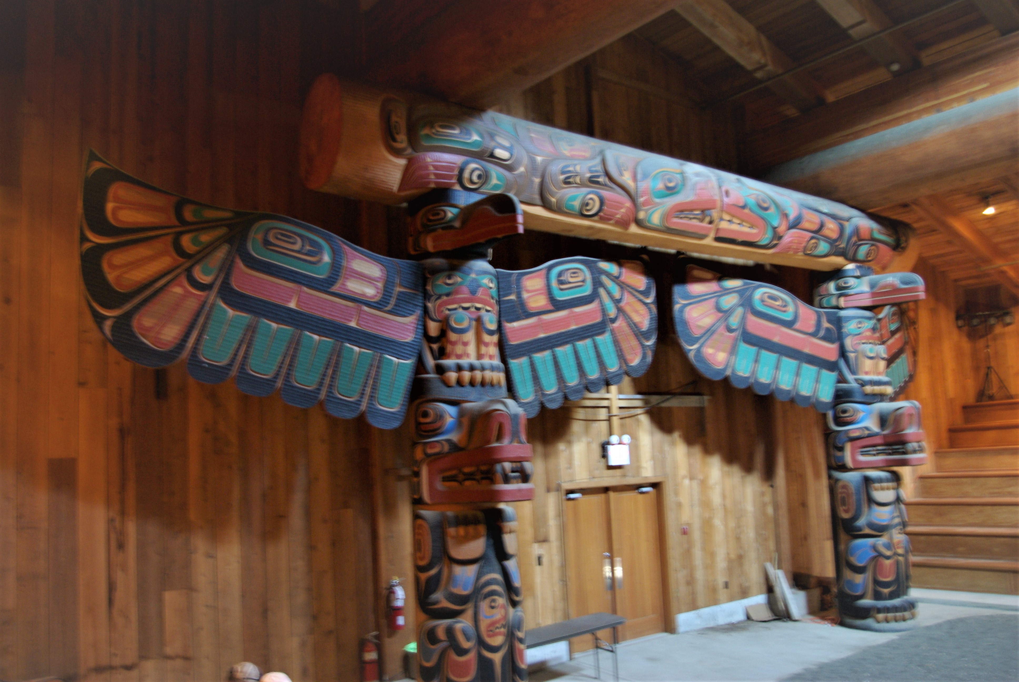 Shortly beyond, Klemtu came in view on the western hillside. We passed the community and made anchor in a small bay called Clothes Cove. We took the dinghies back to the village where we were given a tour of their magnificent Long House by Shane, a hereditary chief. Ceremonial uses were heralded by the lightly acrid smoke in the air. Built with massive cedar beams, its spectacular carved lintels at each end represent the four families of this Kitasloo village: eagle, raven, killer whale and wolf.