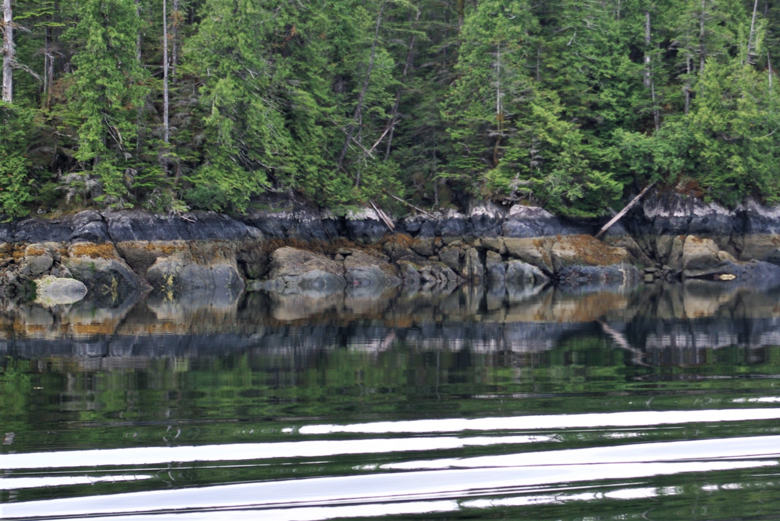 The narrow passages into these inlets are quite protected, with tide changes, but little surge. Reflections along the water line strike vivid angles on the glassy surface.