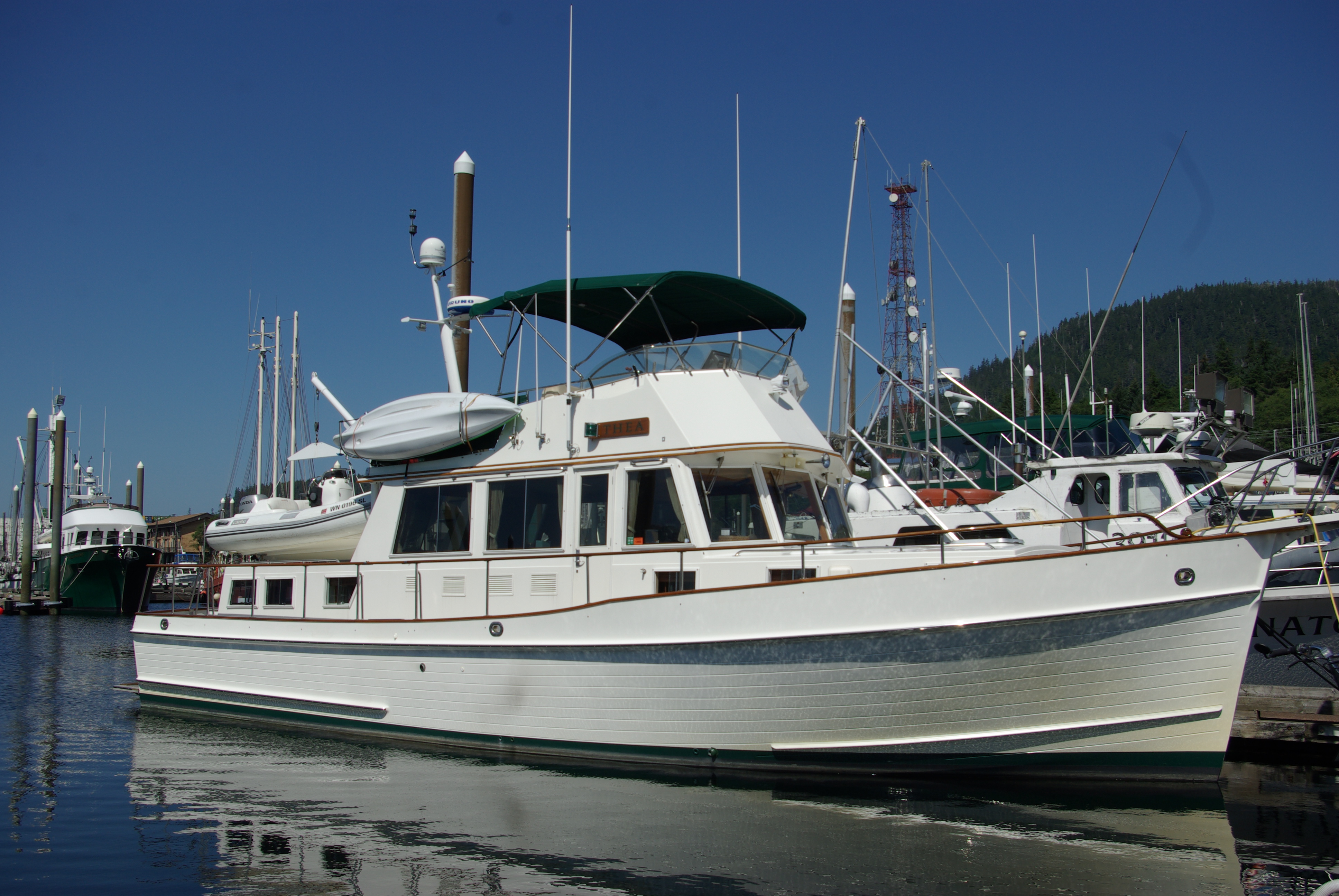 Thea, a Grand Banks classic yacht, was well-equipped for cruising wilderness waters. Designed like a 46-foot trawler, she carried an impressive array of navigational equipment, including GPS guided autopilot, lap-top displayed depth and distance charts and radar. Featuring twin-engine diesel motors, she was most efficient at about 8 knots. There were three berths, two heads, a well-appointed galley with fridge and freezer, an ice maker and microwave, washer and dryer, with a drop-leaf teak table in the adjacent salon. All-in-all, quite commodious accommodations.