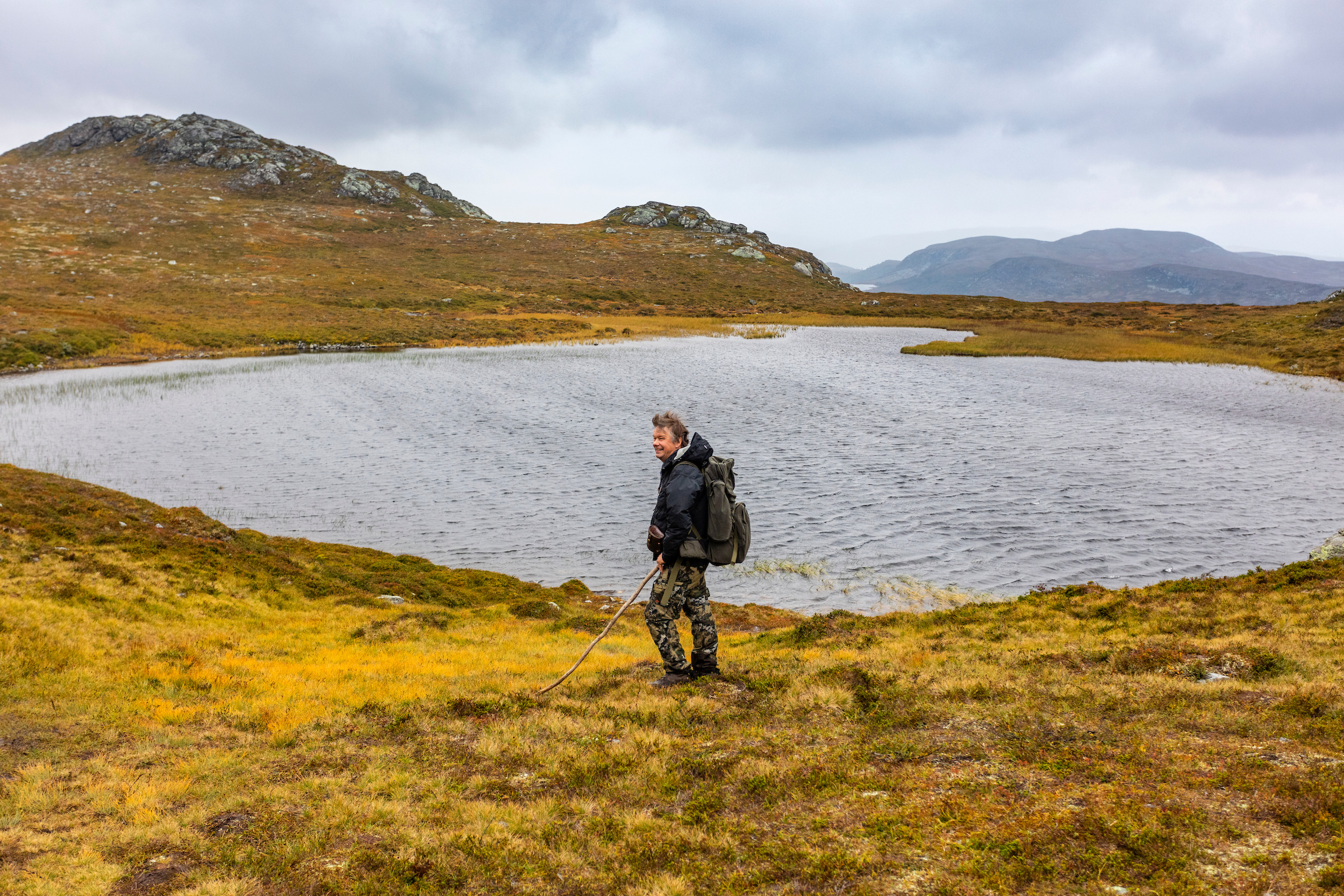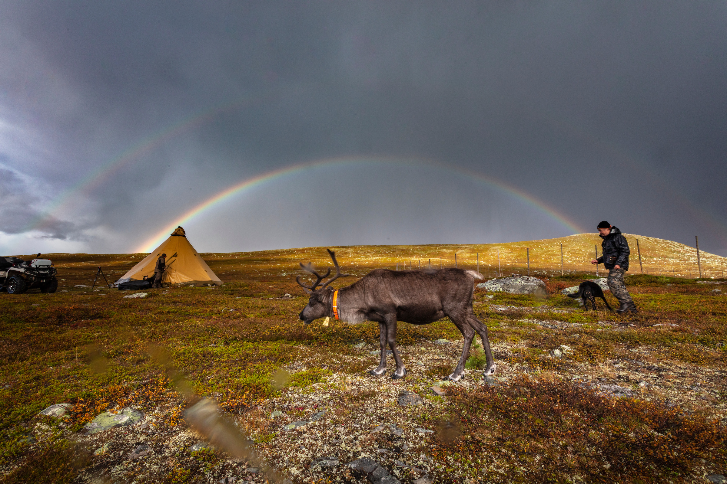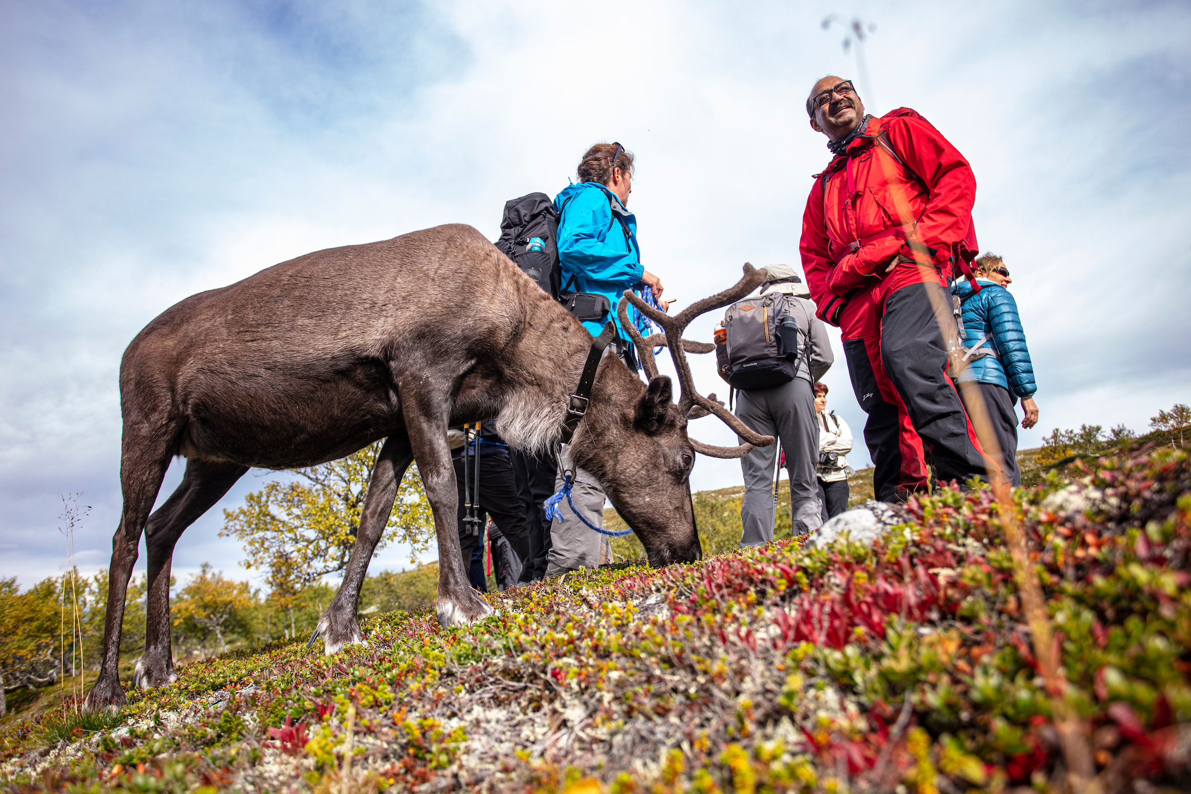 The rapid changes in weather, from the sun to horizontal rain thanks to strong winds, make our medium hike of only nine kilometers into a full-day tour. Of course, this wasn't helped by a group that was easily distracted. It's natural when you have a handful of photographers, filmmakers, and bloggers hiking together. It’s like kids on bicycles, every couple of minutes someone goes missing. At times a member of our party would be hanging rear-end up out of the bushes photographing shrubs of special interest, at other times, rear-end up because the swamps and rocks had caught us by surprise. Peter is clearly amused by all our collective activities, something that appears to be non-standard compared to the usual tours he guides. Generously he accommodates most of our activities and calmly oversees his flock from the back, making sure no one goes missing for good and collecting our dropped equipment. To him, this is a bit like reindeer herding, just vice-versa. With his reindeer, Peter takes the lead with one of the tamed reindeer accompanying him on a rope. Traveling from forest to forest that is full of lichen, the main source of food of the reindeer. Once the tamed reindeer follows, the whole flock tags along.