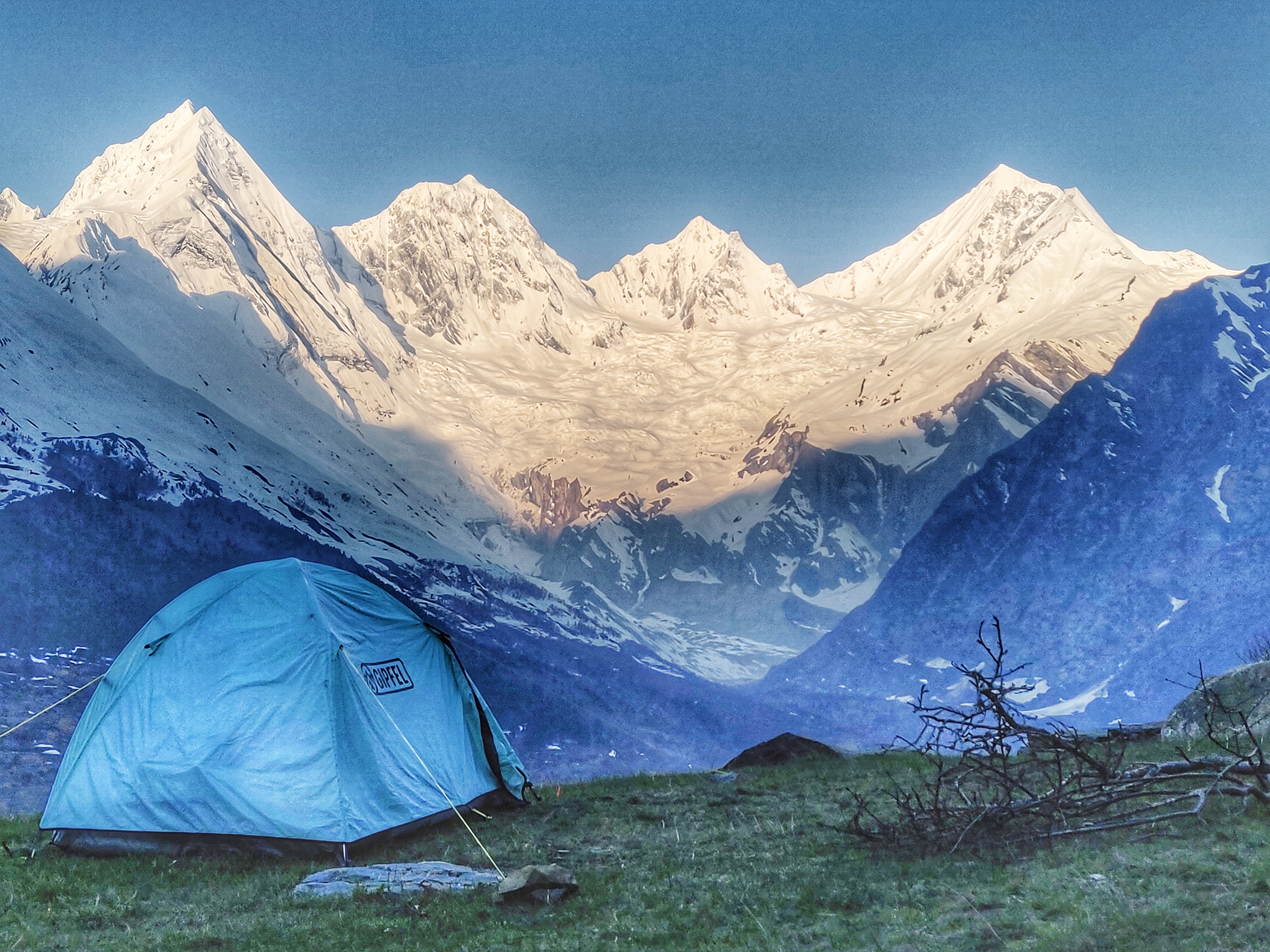 If you go solo, without support, there are no porters and no animals. And if you want to do it in a pretty good pace then you have to minimize your luggage. Normally I go pretty fast across these passes. So even if the pass is at 5,000 meters, I set up my base camping site below 3,000, do the pass completely and again get down to below 3,000 because camping at lower altitudes allows you to stay warm. As you carry more gear, you become slower. As you become slower, you need to carry more gear and more food. So my minimalistic approach with just carrying 6 kg works well. Most of the time I just run in my shorts and T-shirt, as opposed to the typical image you have of a hiker with a full down coat. Only at night when I get settled into sleep do I layer up. The most important gear for me is my rain jacket. Secondly, my lightweight fleece allows me to keep warm against the cold winds.