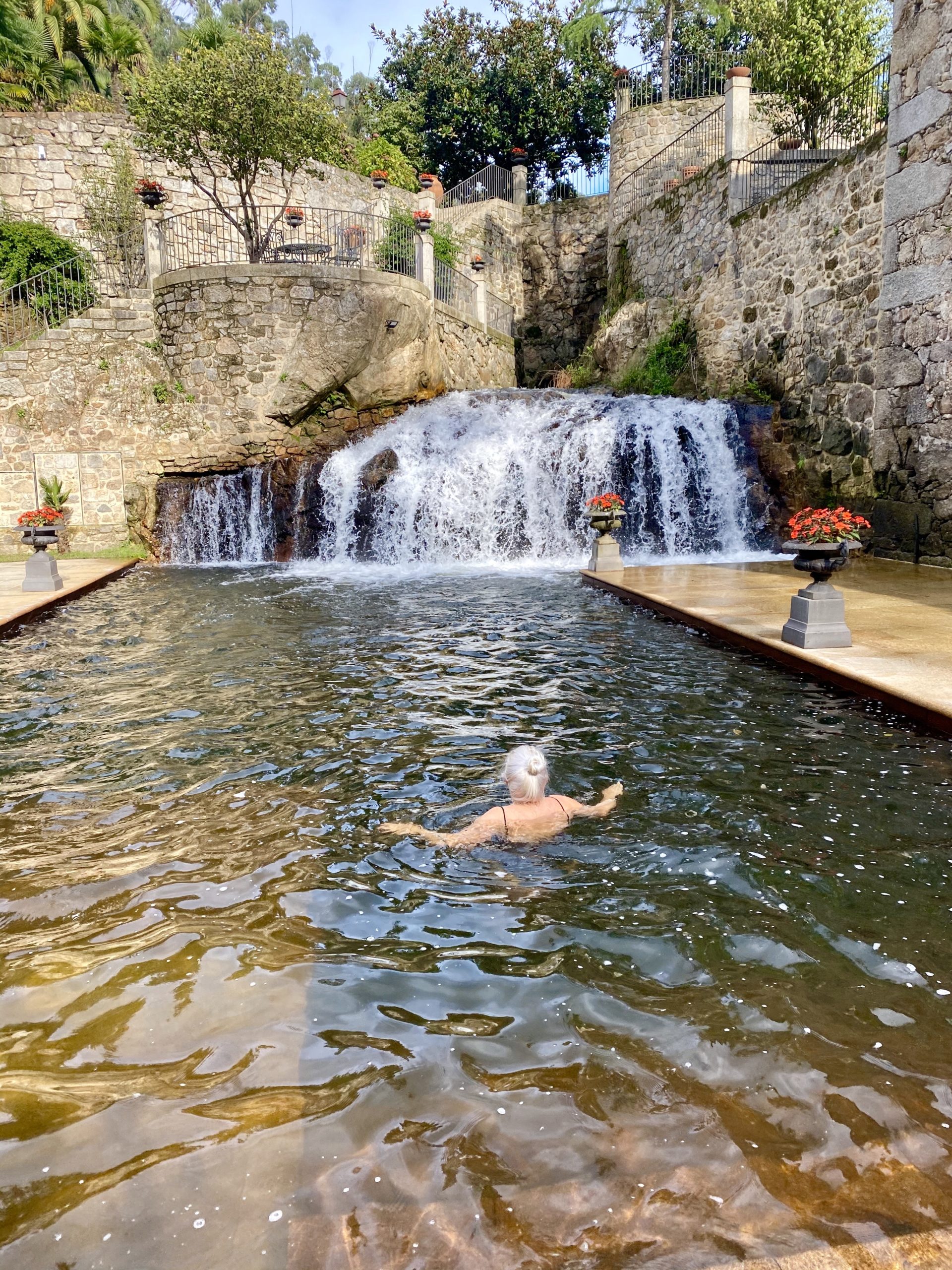 Our entrance into the historic spa town of Caldas de Reis is spectacular but regretfully rushed. Anxious to unload at our hotel, we cruise right past a picturesque waterfall that hushes below a shaded cafe. Before we know it, we’re racing out of town and up a steep highway road. There’s no shoulder and it was clearly never intended for pedestrians. Yet, we’re adamant about sticking to our commitment to only walk the Camino. After 15 miles, we gratefully reach the Torre do Rio, a beautifully restored 18th-century textile mill. Without even changing, I follow the sound of the rushing river straight into the natural pool that features its own waterfall. Erin and I trust that the chilly water will relieve some of our soreness, although the staff can hear our “wooo-hooo” hooting from three stories up.