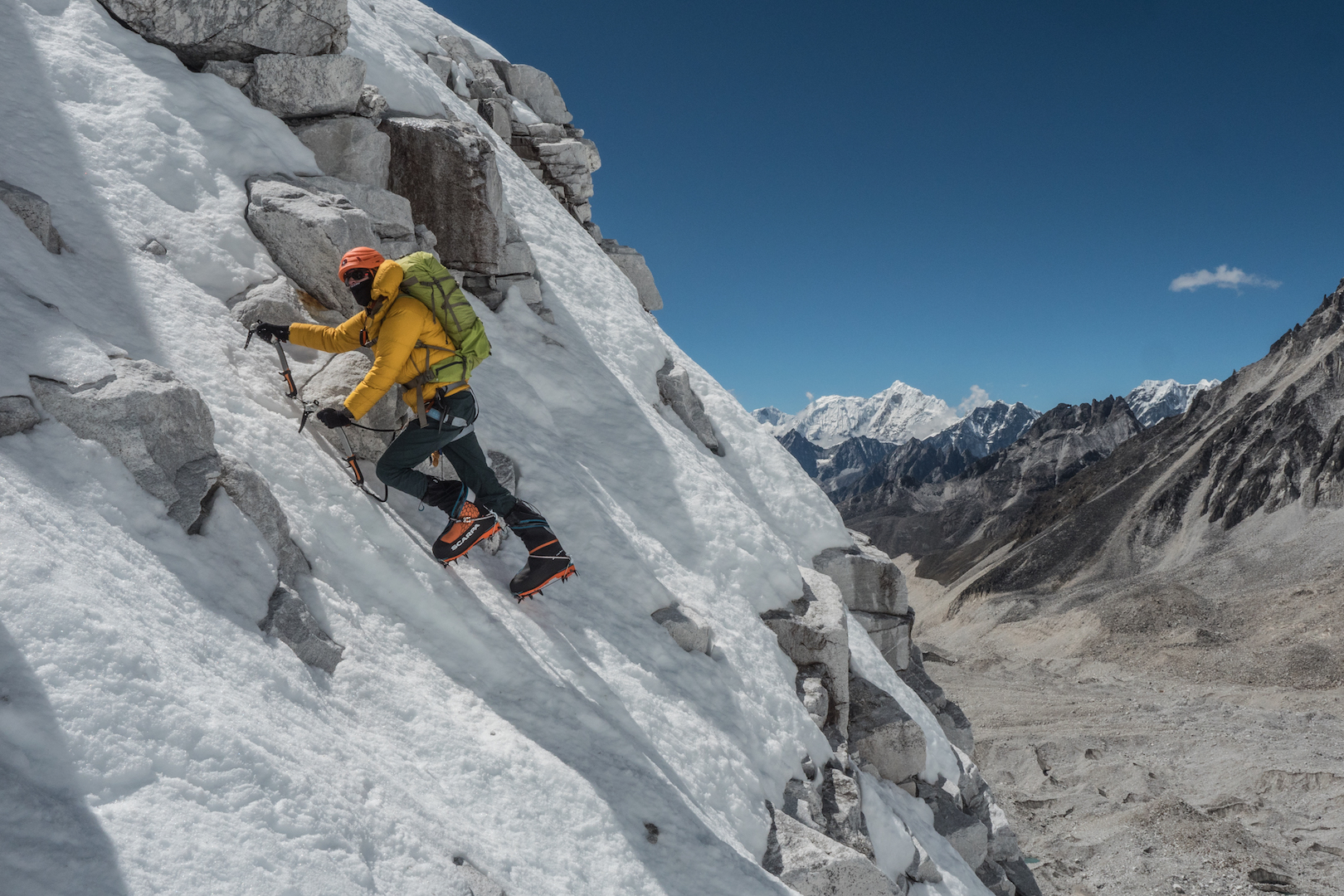 Korbusch’s new strategy was to climb a steep couloir on the right side of Nangpai Gosum II's South face, traverse to a prominent spine on the right side, ascend to the ridge of the first false summit, and then continue towards the top. He would climb it in as pure a style as possible: “I went minimalist: no ropes, no ice screws, nothing. I just took my harness and one carabiner in case of a helicopter rescue.”
