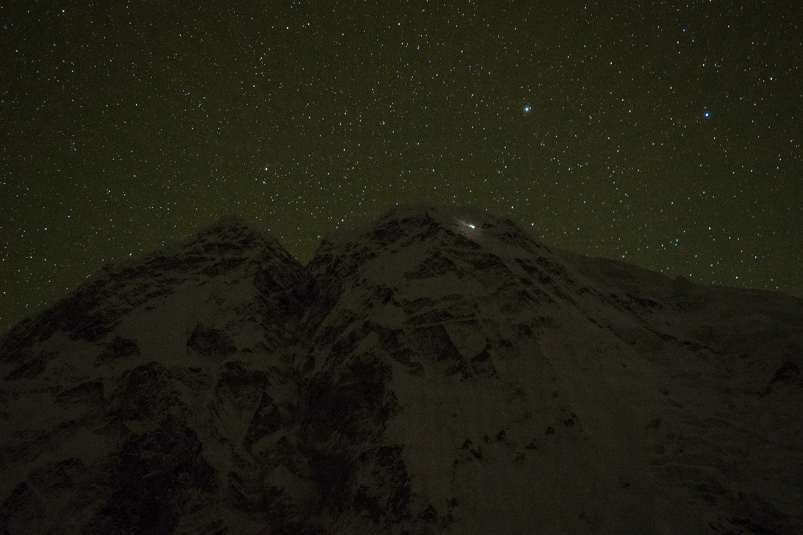The second day he ascended to 6,840 meters. “It was an easy day. It was going good. I was there before sunset,” he says. After a few of hours of sleep, he roused at 10:00 pm, and started his summit push. Catching the sunrise from the first false summit, Kobusch drank in the curve of the earth as he sat above the clouds and gazed towards Everest, steeling himself for the final summit-ridge slog.