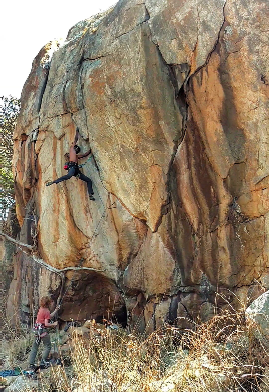 The next day, Stan shoved a couple of cams in a horizontal crack five feet off the ground and cruised up the next 25 feet of a technical slab with no protection! He came down grinning, and named it, ‘The leopard that came for Chai, E1’.
