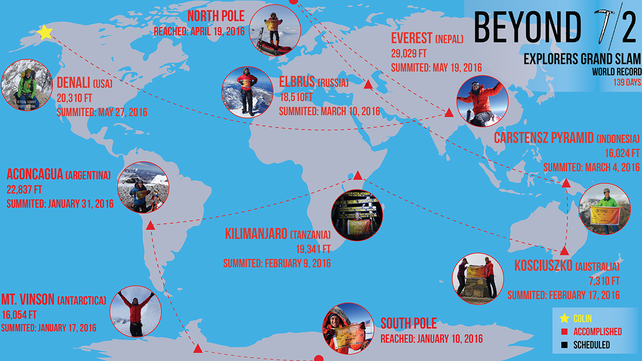World records tumble.The date was May 27th, 2016. Colin had climbed the 7 highest mountains on each continent, and reached the north and south pole, in just 139 days. Shattering the previous world record which was 192 days. Just 50 people have ever achieved this feat, only 4 have done so in under a year. However, in stereotypical Colin O'Brady style, he also broke a second world record, he summited all 7 peaks in just 132 days.
