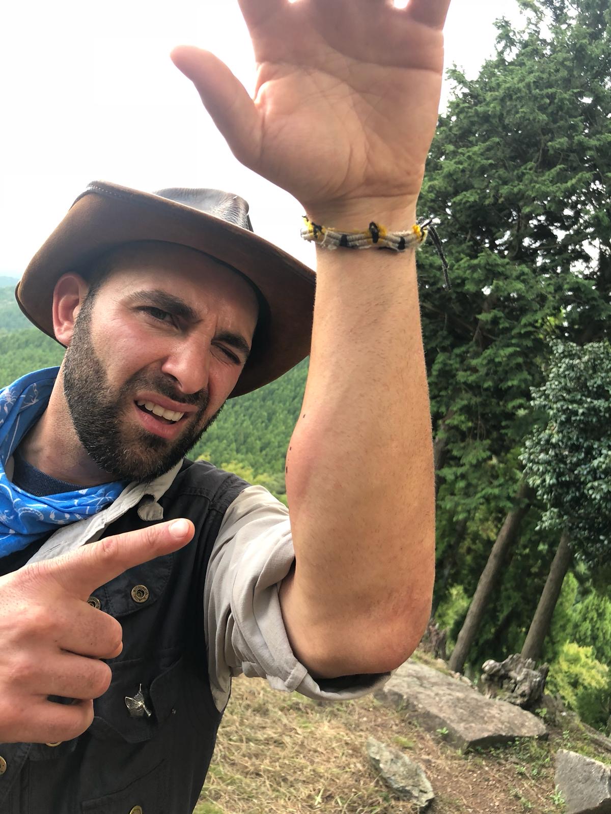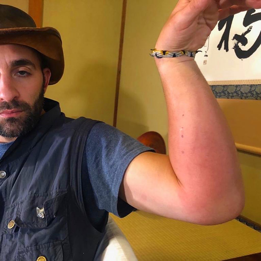 Coyote: The immediate impact of the sting felt like I called Iron Mike Tyson a "little pigeon sissy" in a dark alley where no one could see him haul off and wallop me full swing in the lower jaw. In short, it hit me like nothing I’ve ever experienced and I literally saw a flash of white and almost passed out. The burning of the venom in my arm was like someone shoved a hot ember cooked poker into my forearm and kept pressing harder and harder. The swelling began within seconds and I barely remember finishing the episode. I was in considerable pain for more than seven hours and by considerable, I mean a pain that most humans would probably not be able to stand. A few tall Japanese beers I hoped would help the pain and agony, alas, they did not, haha. I did take some Benadryl because of the swelling, that had zero effect as my hand and forearm ballooned to nearly twice their normal size. A ‘sensitive to touch’ pain lasted for nearly 36 hours and the swelling persisted for roughly the same duration. Fortunately my body fought off any necrotic aspects, so I experienced no cellular damage externally but boy was it a rough couple of days after the sting for ole’ Coyote. I felt like the cartoon Coyote character after a full episode trying to catch the Road Runner, defeated, broken, swollen and waving the white flag. I wasn’t necessarily ever afraid during the process, after you are stung if no allergic reaction kicks off within the first five minutes, you are usually in the clear. Meaning you are not heading toward anaphylactic shock – this is the WORST thing that can happen - and YES we always have an epi-pen on location with us just in case my body takes a turn for the worse.