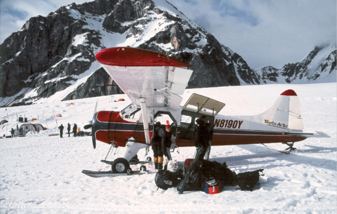 Arriving at the flat landing strip that is carefully staked out between several crevasse fields that could swallow the Cessna’s whole, is an adventure in itself. The take-off from the small town of Talkeetna, Alaska (“A quaint little drinking town with a climbing problem” as the sign said) was from a small paved airstrip. All the gear, in heavy-duty North Face duffel bags, was stuffed in the rear of the small plane that sported a small sign that mentioned that in order to smoke, you’d need to step outside.