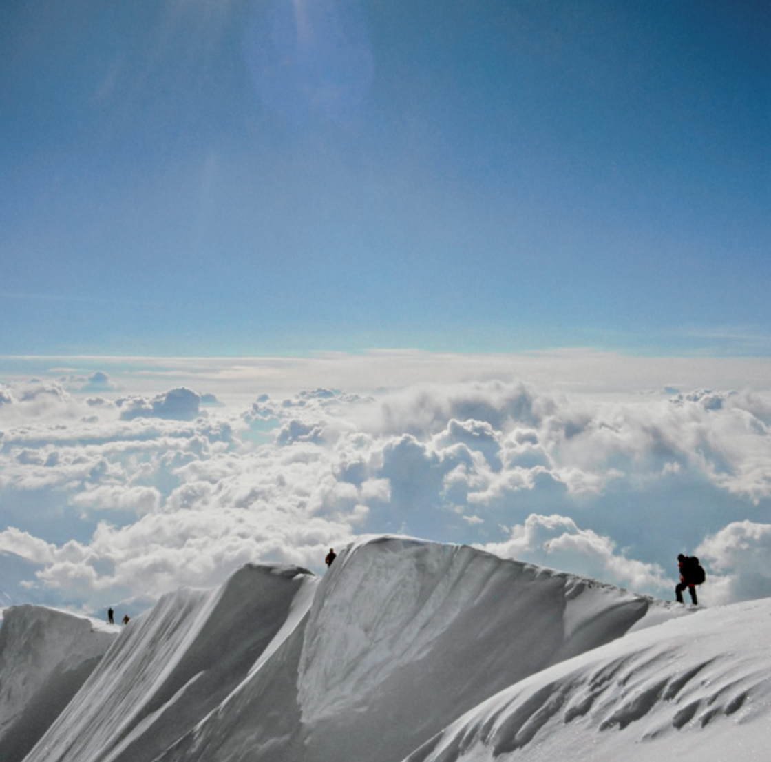 From the saddle that separated the two summits of Denali we slowly continue up over an easy slope. Though it is not steep, the altitude makes walking very, very hard and we’re glad when we reach one of the last parts of the climb- the “Football Field”. This flat section leads us to a short but demanding last climb in order to gain the summit ridge which offers a great finale to this grand adventure. The ridge is not very steep, but only a foot wide in places and the views are spectacular.