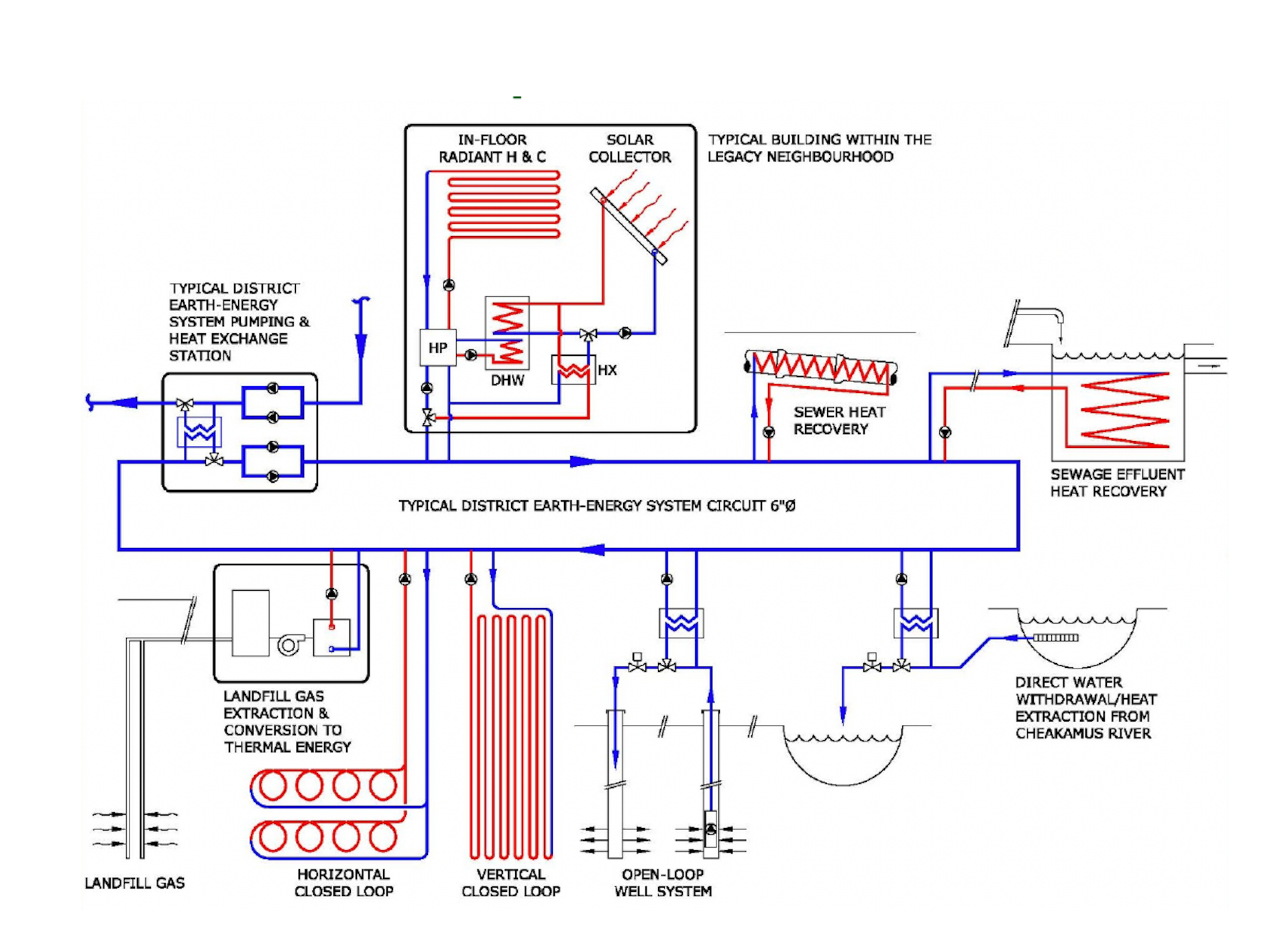 To achieve zero carbon emissions, the latest strategy uses a design known as an ambient temperature loop that simultaneously and efficiently both heats and cools different buildings. This concept was first developed for the Whistler Olympic Village in British Columbia.