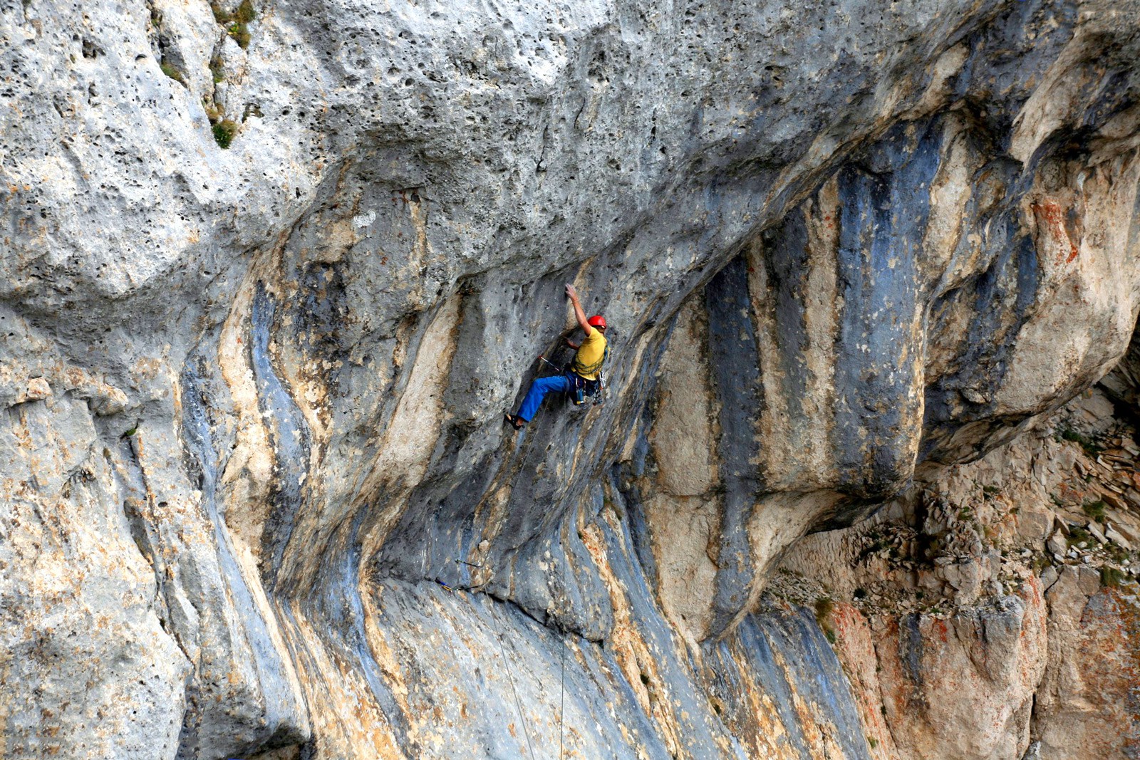 Anyway, three weeks later, while I am aid climbing the same pitch, trying to reach the upper headwall, the good old orange bolt suddenly pops out from its hole, while I am hanging on it. I hit the slab below with my left hip and – Roberto will tell me this later – I pass out. I end up dangling in space, upside down, a few meters from the wall. Now everything is on him: Roberto uses the service rope to take me back to the belay and wakes me up. The hip is hurting badly and my helmet is full of blood. Everything else seems to be ok. I’m mad at myself, and I want to start over. I tell him that I will wait for a few minutes and then I will go up there again. I am in shock and I do not even realise it. Roberto, with no words and precise manoeuvres, arranges the rappels. As the adrenaline rush fades, I realise that I cannot move.