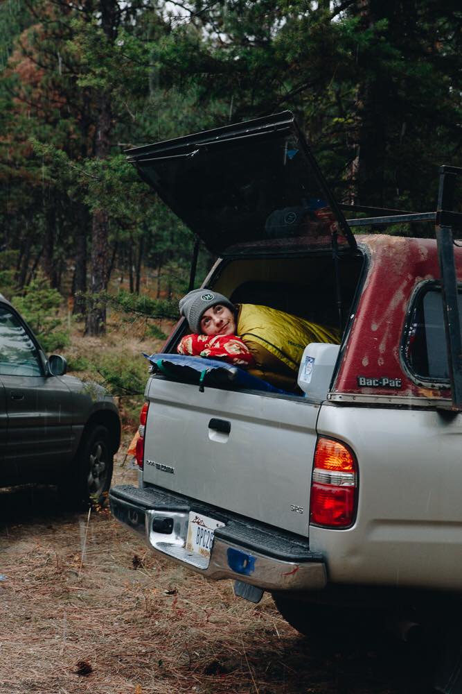 No glamour down here. Grunge, filth, and grease, are some more accurate adjectives that could be used to describe this lifestyle. Rather than having the long, flowing, groomed hair of the woman in the Instagram photo I saw, my hair tends to either be in a messy up-do, or underneath the coverage of a hat. Not because it is cold, but because I haven’t showered in eight days and need to cover up the grease that has accumulated on my scalp. Rather than the beautiful twinkly lights strung above cedar cabinets, I wear a headlamp purchased at REI and stuff my clothes into plastic tubs that pull out from underneath my plywood bed. Rather than a shiny stove and spotless counter-top, I have a two-burner Coleman camp stove that I place atop my truck tailgate, and a plastic jug of water for a makeshift sink. And rather than having a perfectly clean dog, I have no dog. Instead, sometimes I adopt my dirtbag friends into my truck for a week or two of partnered shenanigans. (Author’s note: I wish I had a dog. I am simply not enough of a functioning adult yet to be able to take care of another creature. I struggle enough taking care of myself!)