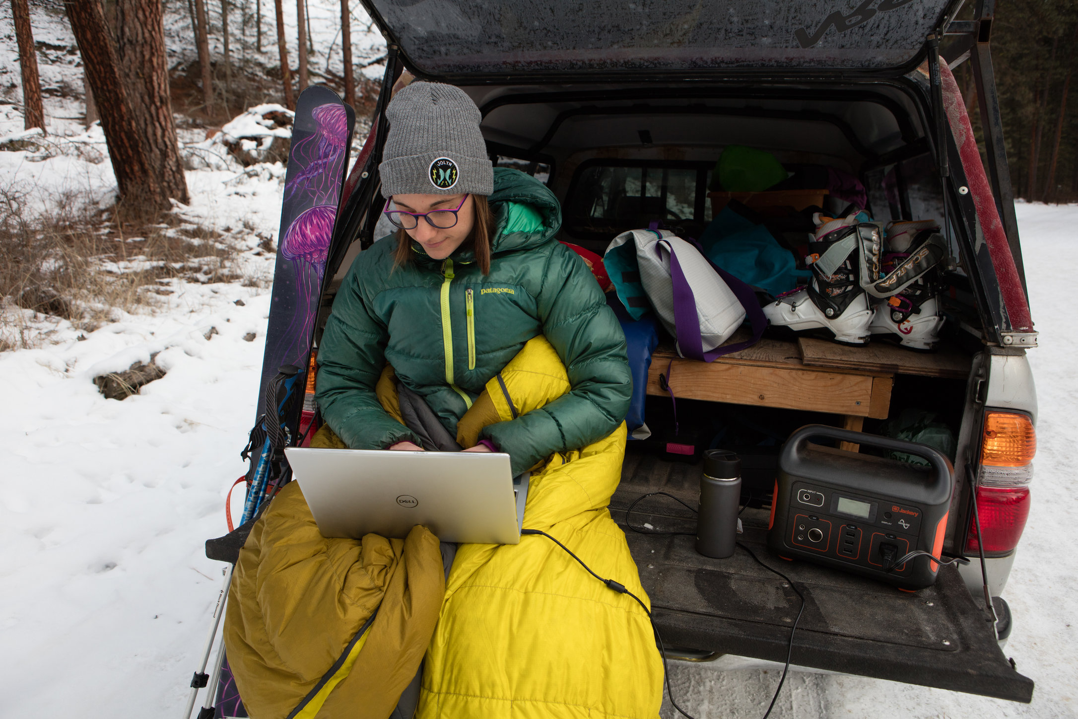 Crawling into bed with the back window of my truck open so I can view the stars as I drift off to sleep. Waking up to cold desert wind on my face, but feeling cozy and warm inside my sleeping bag as I lay in bed and watch the sun rise. Getting to cook a breakfast of bacon and eggs on my tailgate as I listen to the sound of the river rushing next to me. Sitting on a dock over the water on the Sunshine Coast of British Columbia, looking for whales as I type up an article about one of the most badass female mountaineers in history, while my laptop charges via solar power from my Jackery portable power station. Listening to my friend, Mack, play banjo around a campfire after a long day of climbing. Sitting on my tailgate for a beer with my ski partner after a big day touring in the mountains. Having the freedom to go wherever I want, whenever I want. To me, this is what luxury is all about.