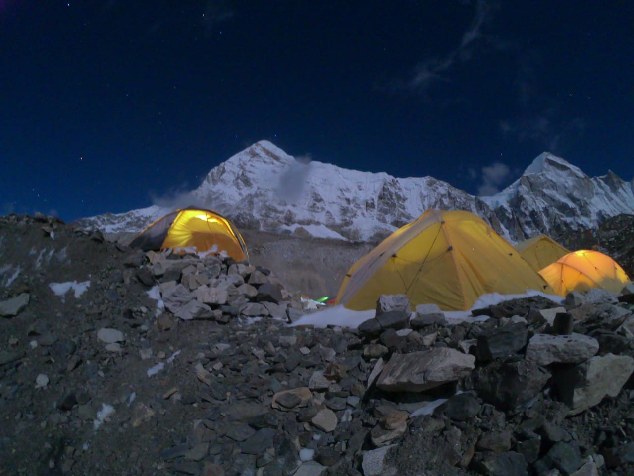 I am standing on the "top of the world" at 8,848 meters (29,028 ft) with my husband, Norbu Sherpa. We are alone in the full moon: Norbu, me and the Goddess Chomolungma. The stars are lighting up a pure sky. The atmosphere is simply magical. One-and-a-half hours in the silence of the mountain on the top of Mount Everest.