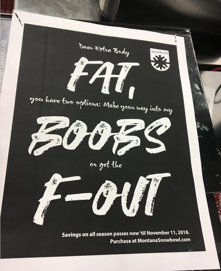 A social media user shared a photo of the advertisement on Facebook, which then circulated quickly through the Missoula ski community, receiving over 100 shares in under two hours. One social media user commented, “Jesus. H. Christ. It’s 2018, my grandma had to deal with this shit, and we still have to now?!”. Another said, “I can’t even imagine why anyone would think this was ok, funny, edgy, or whatever. It’s fucking terrible!”