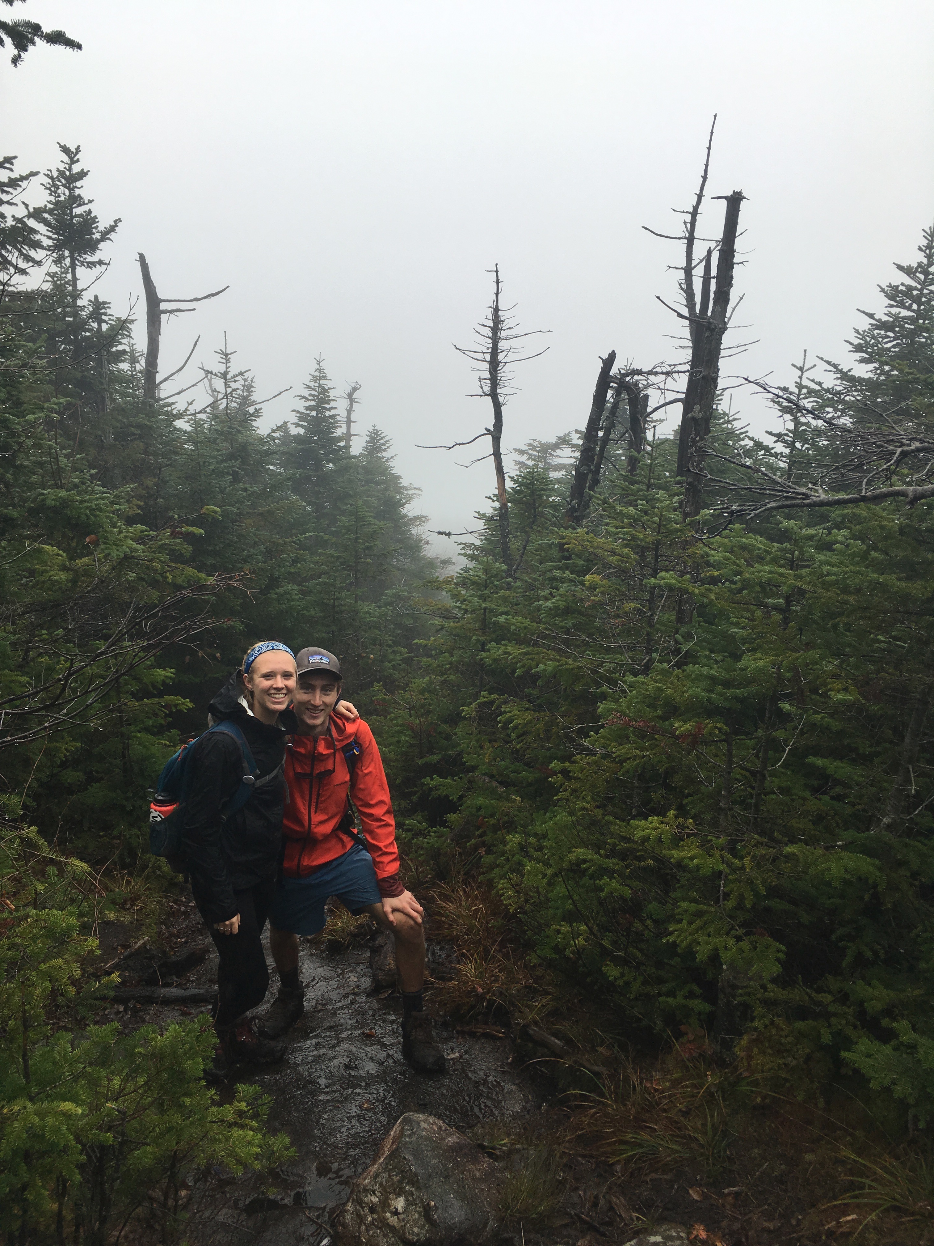 Noah Allen and Becca Miceli on the descent from Nippletop, posing together on a slippery section on the way down.
