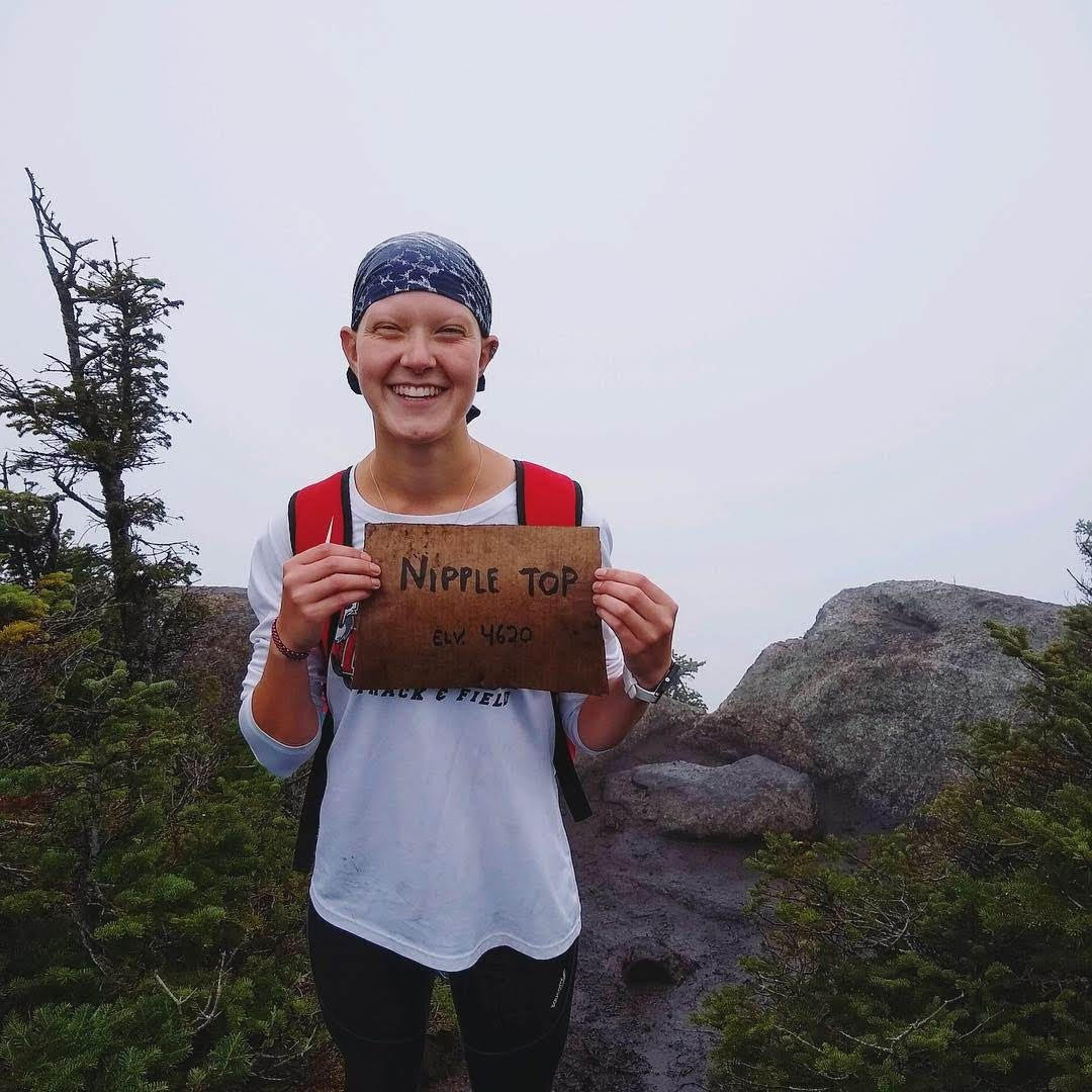 Jenna Robinson on the peak of Nippletop with a homemade sign to mark the occasion.