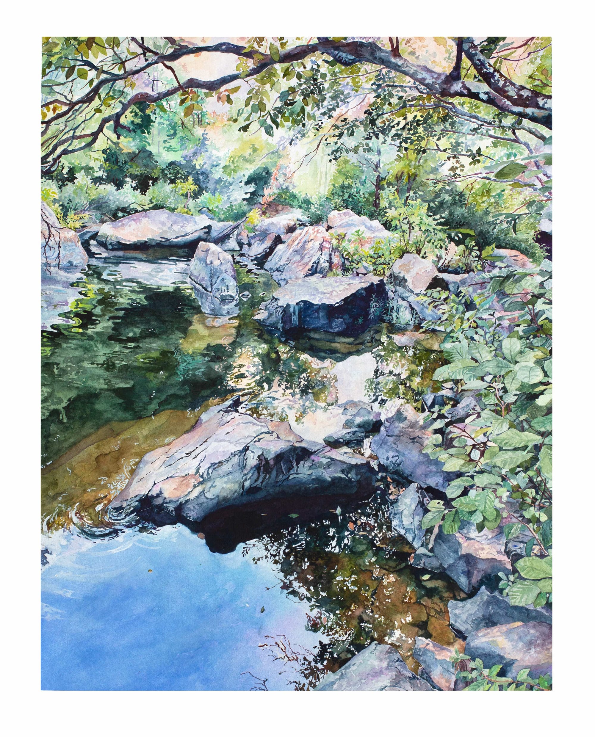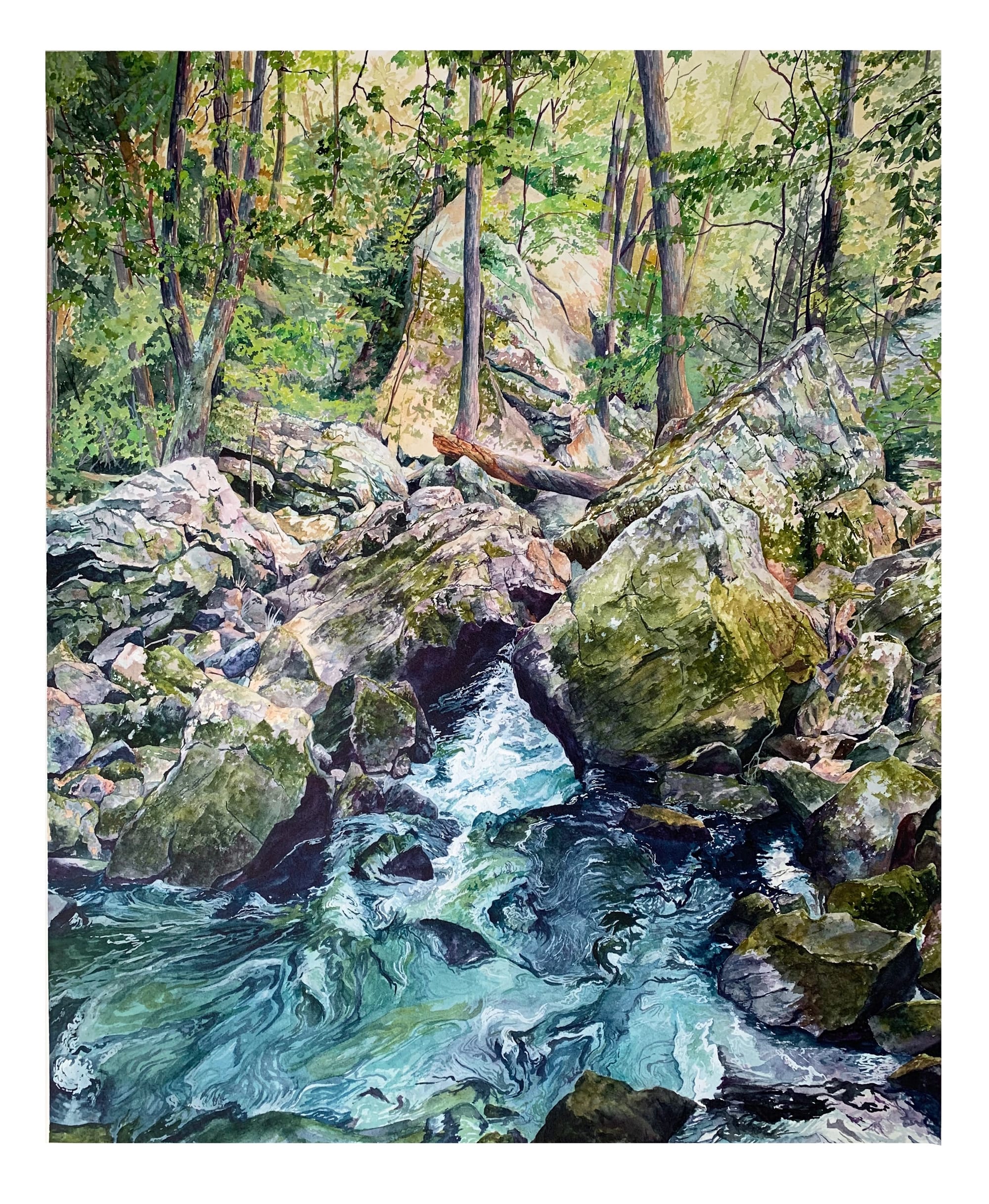 The 28-year-old Booth, based in Huntsville, Alabama, makes her living almost exclusively painting dense southern woodlands. Chiefly, her paintings depict boulder-choked streams rimmed with the deciduous flora of the southeastern United States. Trees and rocks. Water and earth. Humans and animals are never present in her work, and although each of her paintings is inspired by a real location in the natural world, she never reveals these locations. Few, if any, have identifiable landmarks or characteristics.