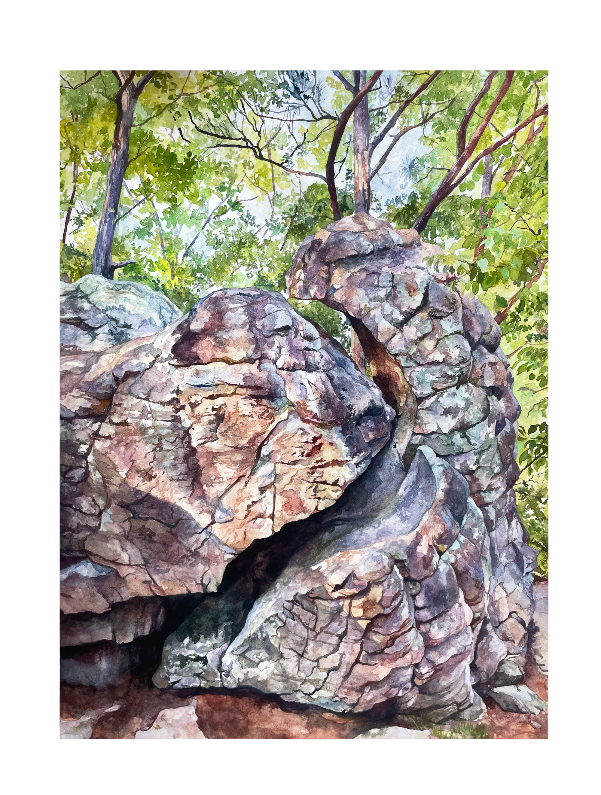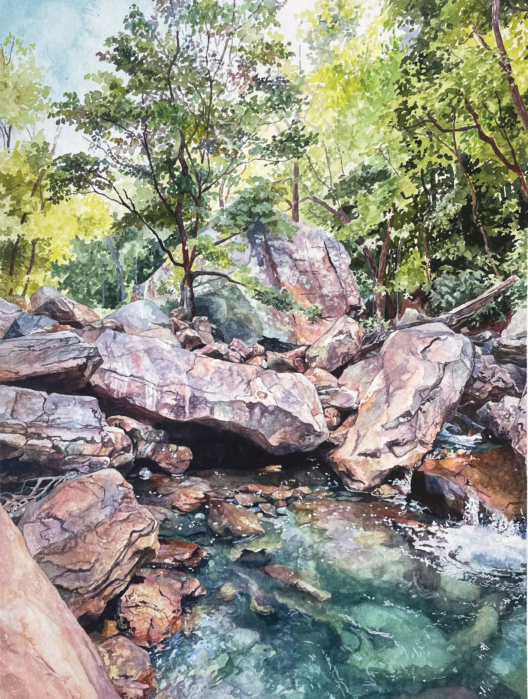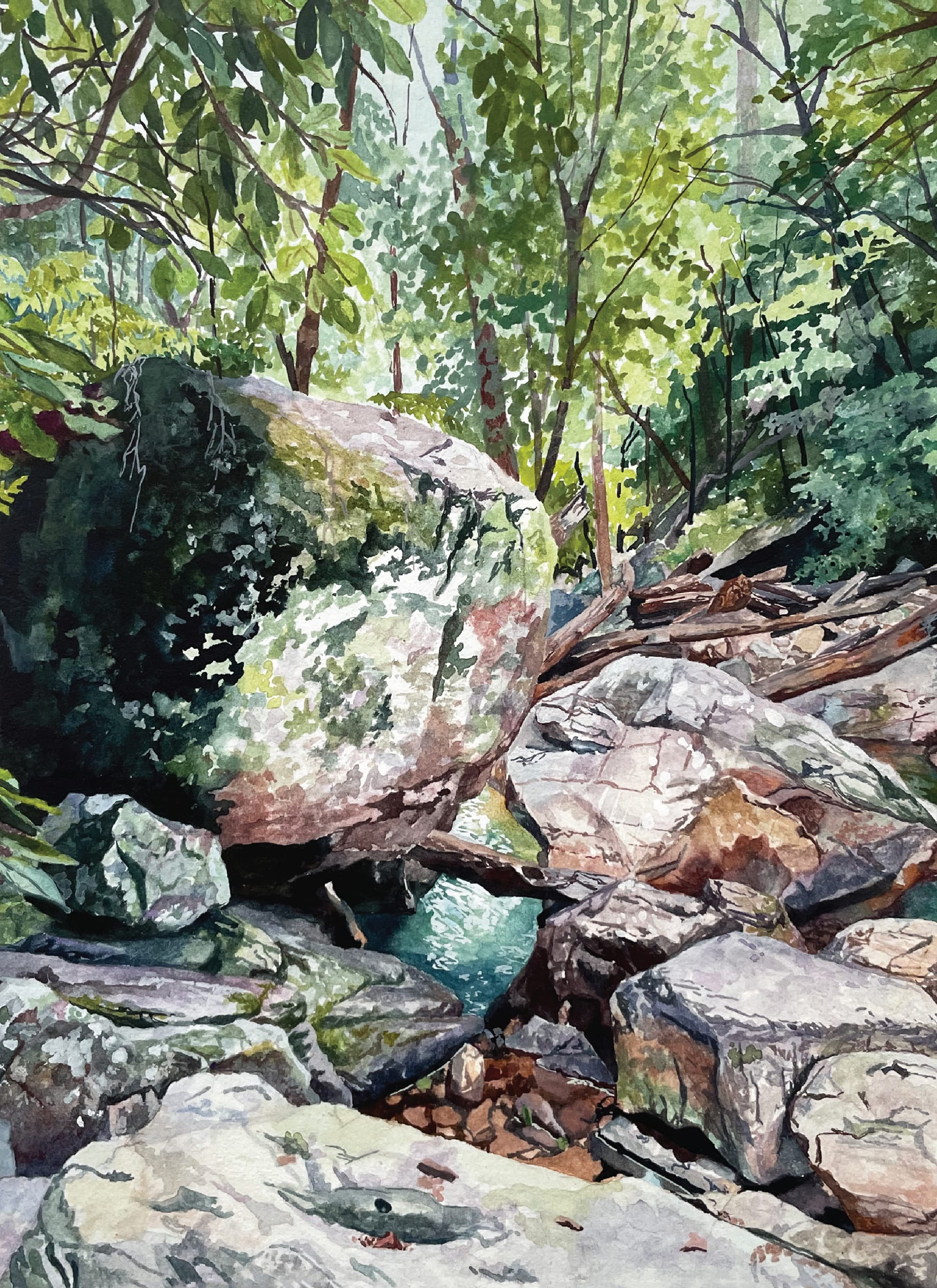 Much of Booth’s story is tinged with irony. She paints the outdoors without naming it, and she’s an avid rock climber who often paints rock, but never paints humans interacting with that rock in any way. She also exclusively paints watercolor—a famously difficult medium—even though she hated it growing up. “I didn't know how to control it,” she explained, “but it was all that was available to me in my apartment during the pandemic.”