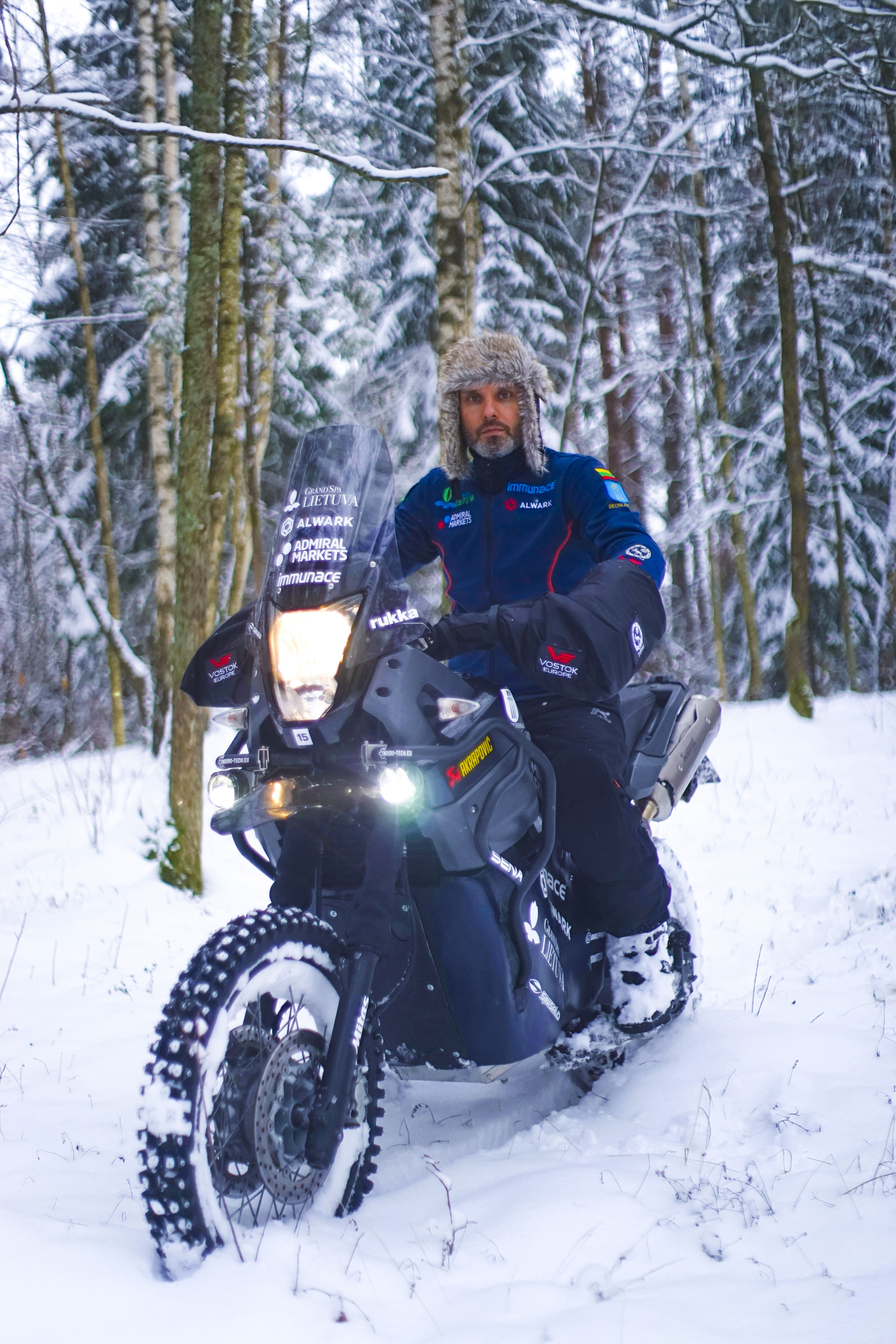 Mieliauskas’s preternatural mental fortitude is vital in a land where the thermometer dips to -60℃ (-72℉). In winter, district officials warn motorists to keep their engines running to prevent stalls. At such temperatures, mettle—and metal—can abruptly snap. Mieliauskas has the resolve to weather the Siberian winter, but is his titanium and carbon-fibre motorbike prepared for the journey? “We made preparations for technical aspects,” he says. “We had to make some modifications for the cold including aviation-grade bearings, special oil for the engine, and studded tires to avoid slipping.” His engine is bedecked with custom covers and insulation to trap heat. It’s a robust outfitting, but in the biting cold of northern Siberia, smooth sailing is far from guaranteed. “There are hundreds of question marks, but we’ll just have to see what happens on the road!” Mieliauskas laughs.