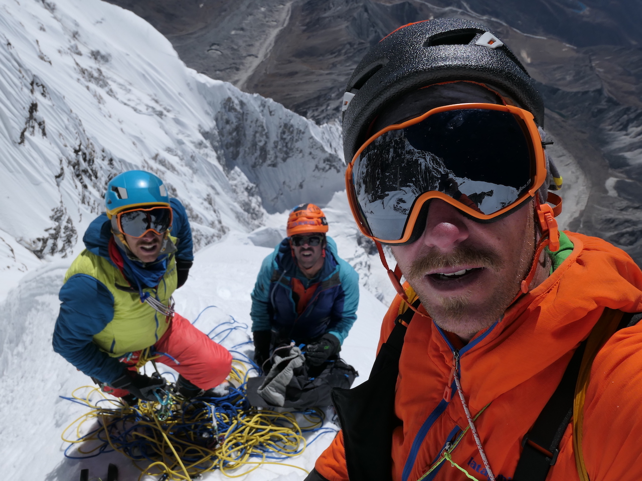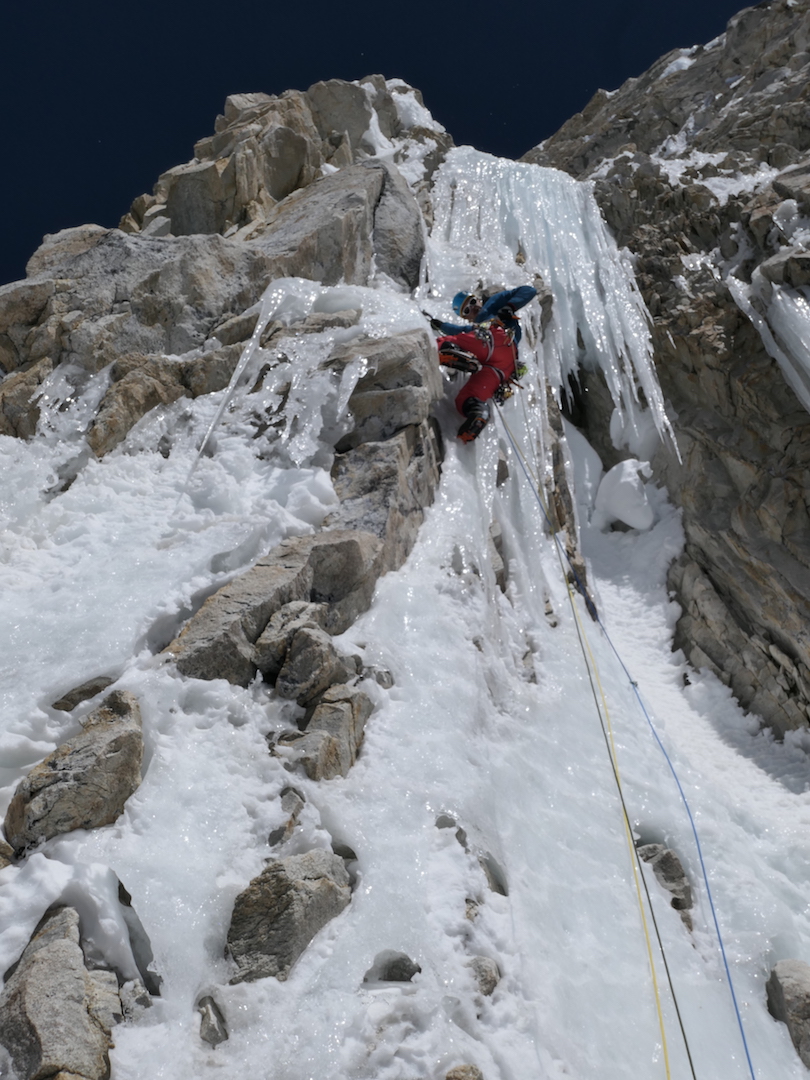 The beginning of their troubles in 2016 happened when they got lost in the ice flutes on the last major snowfield. So this year, on the fifth day the team took a more direct line up the snowfield until they hit a cliff, where they traversed left for one pitch and made a fifth camp on the wall at 7,540 meters.