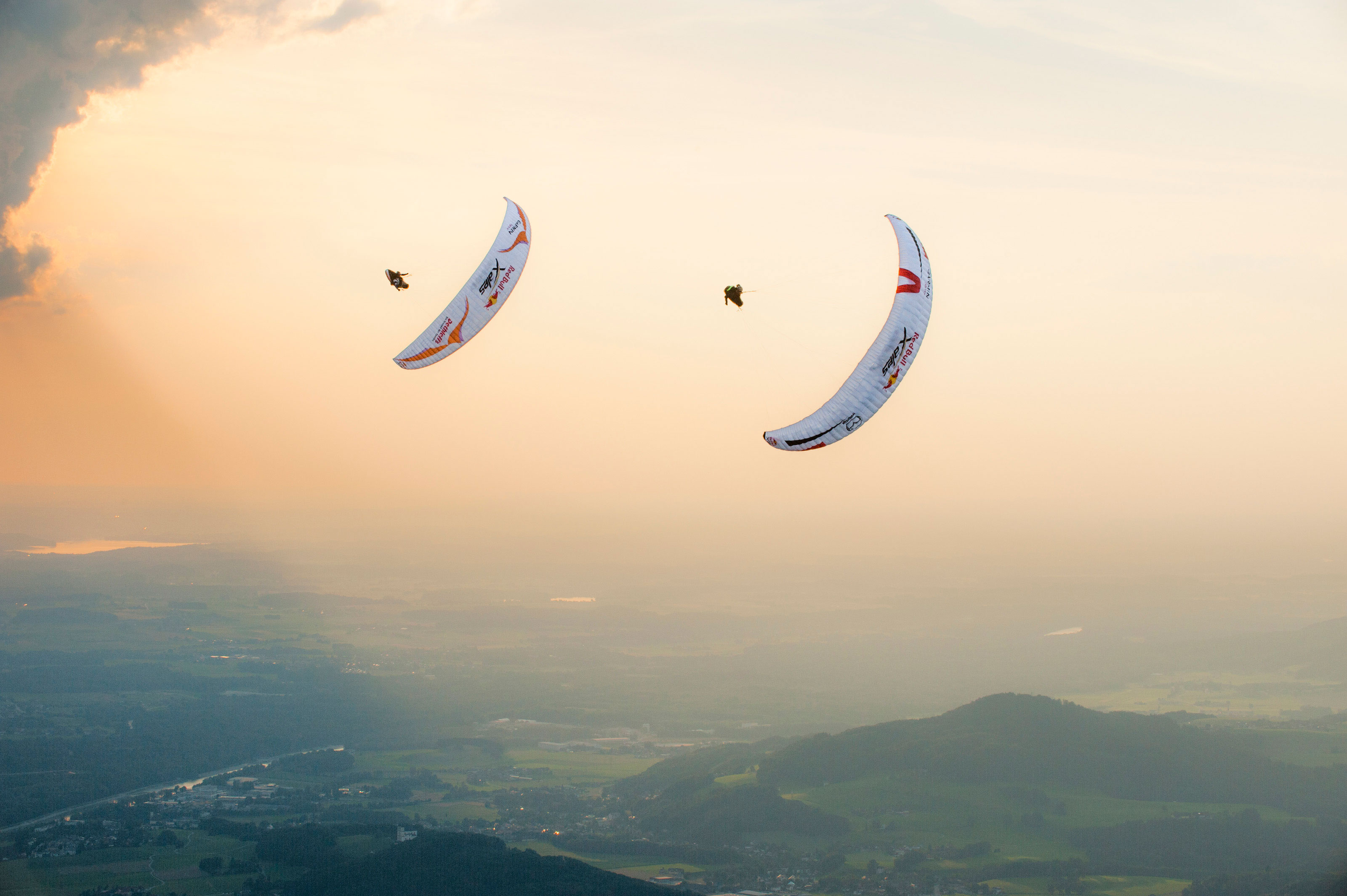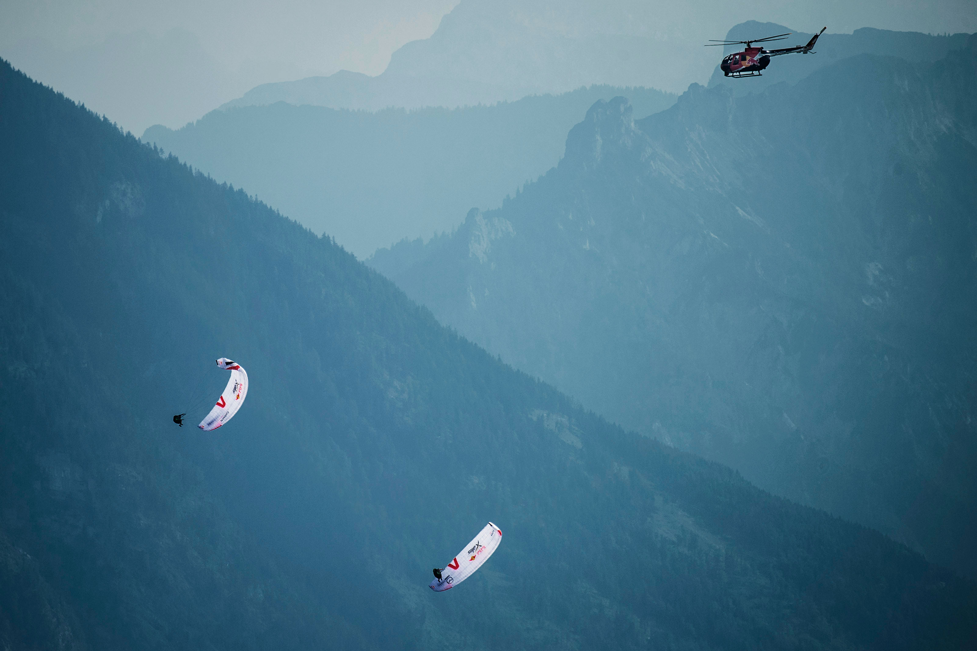 Even though I was in the lead I was starting to get nervous about my call to take the deeper line. But then I got jumped by Stephen Gruber (Austria 3), who was not only an amazing pilot but more importantly lived near here and knew this area probably better than anyone else in the field. Lead on! Then a wing I recognized was suddenly right next to me. Chrigel! He’d crawled up from way back in the pack after getting stuck before the Dachstein and was skillfully picking off pilots one by one. He looked up and while I couldn’t see his face I knew he was smiling and then he seemed to find another gear and accelerated past me like I was standing still. You son of a bitch!!! But knowing Chrigel was taking the same line gave me a huge boost in confidence and I set off, trying to reel him in. The Red Bull helicopter swept in to film the lead three pilots as we found our next climb. You couldn’t have wiped the smile off my face with a cheese grater. The Aschau turn point was only 70 kilometers away and I was in the top three! If we could stay in the air we could cover 15% of the course on the first day! We were high, the flying was magnificent, the scenery mind-blowing and I thought that it was doubtful anyone on Earth was having more fun than I was at that moment.