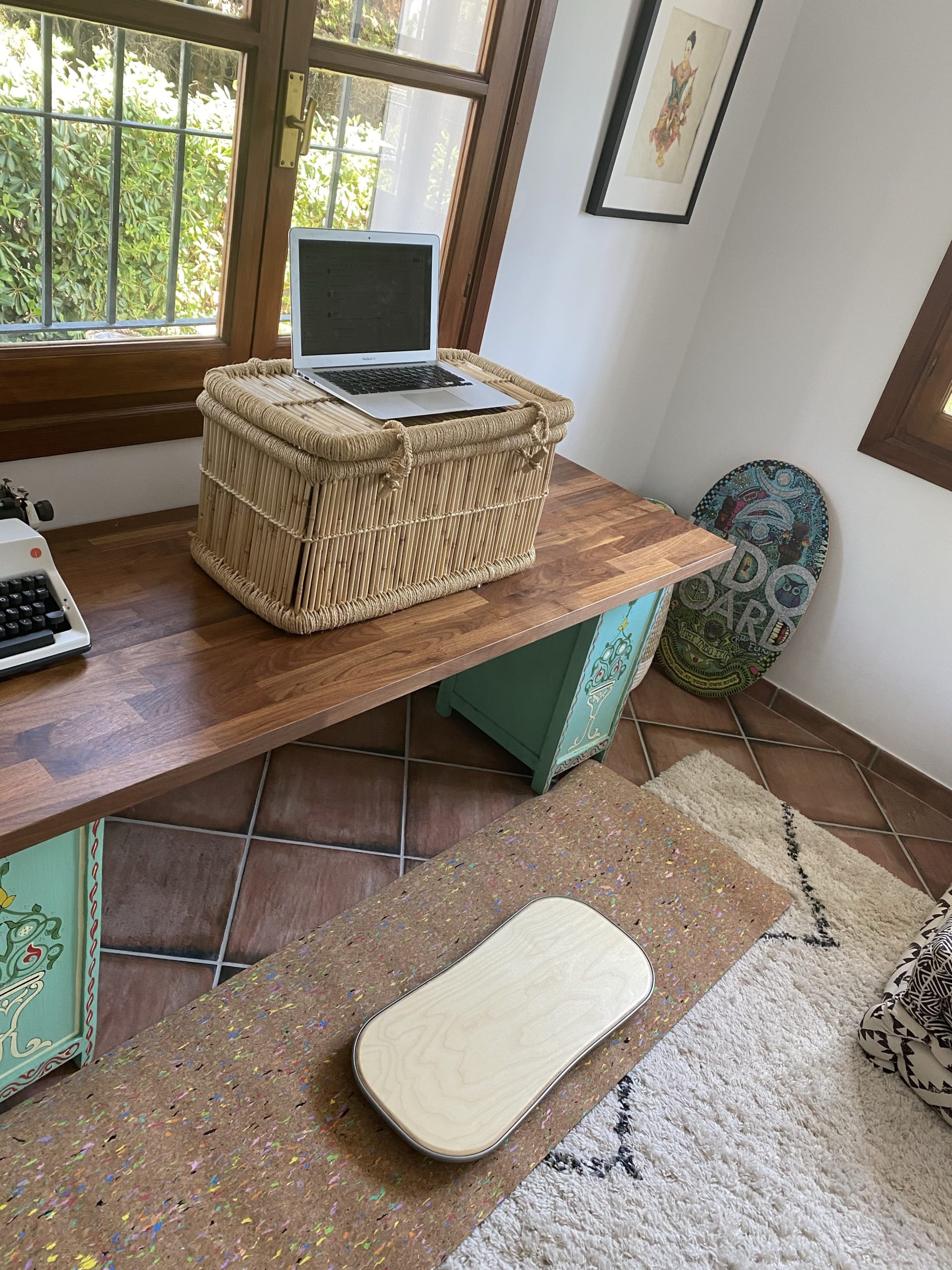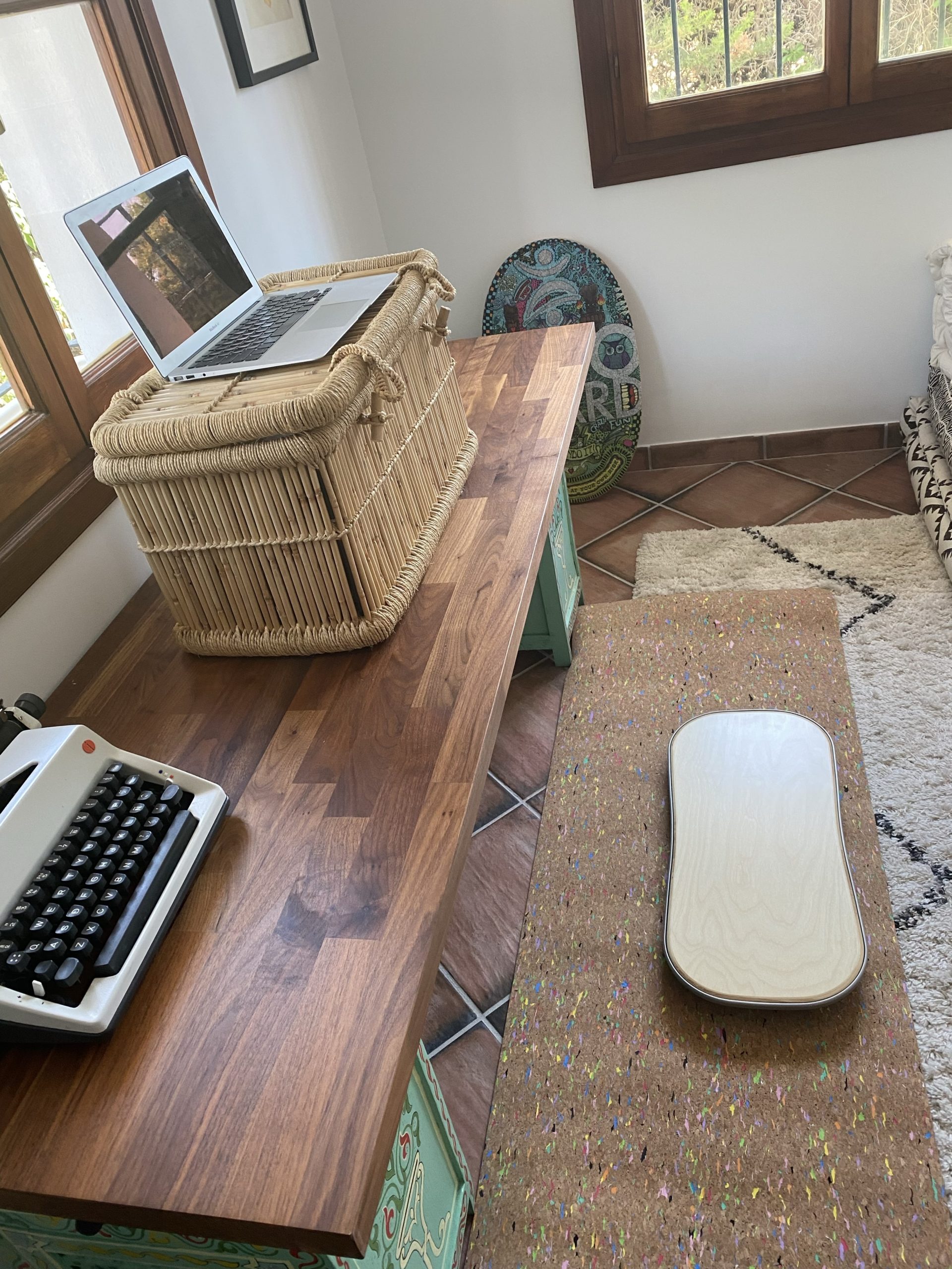 My 2020 resolution was to get rid of my office chair, and I’ve stuck to it. Inspired by the Rewilding Movement, I’ve been experimenting with different ways to improve my mobility, including spending less time in chairs and more time on the floor. When I work at home, I lower my iMac to the coffee table and I sit on cushions. But despite changing my position from squatting to shinboxing, my knees and back do ache after a while, so I alternate with a standing desk. At my typical standing desk setup, my legs are stiff and rigid. Let’s see if the FluidStance balance board provides a healthy, fun, and worthwhile alternative.