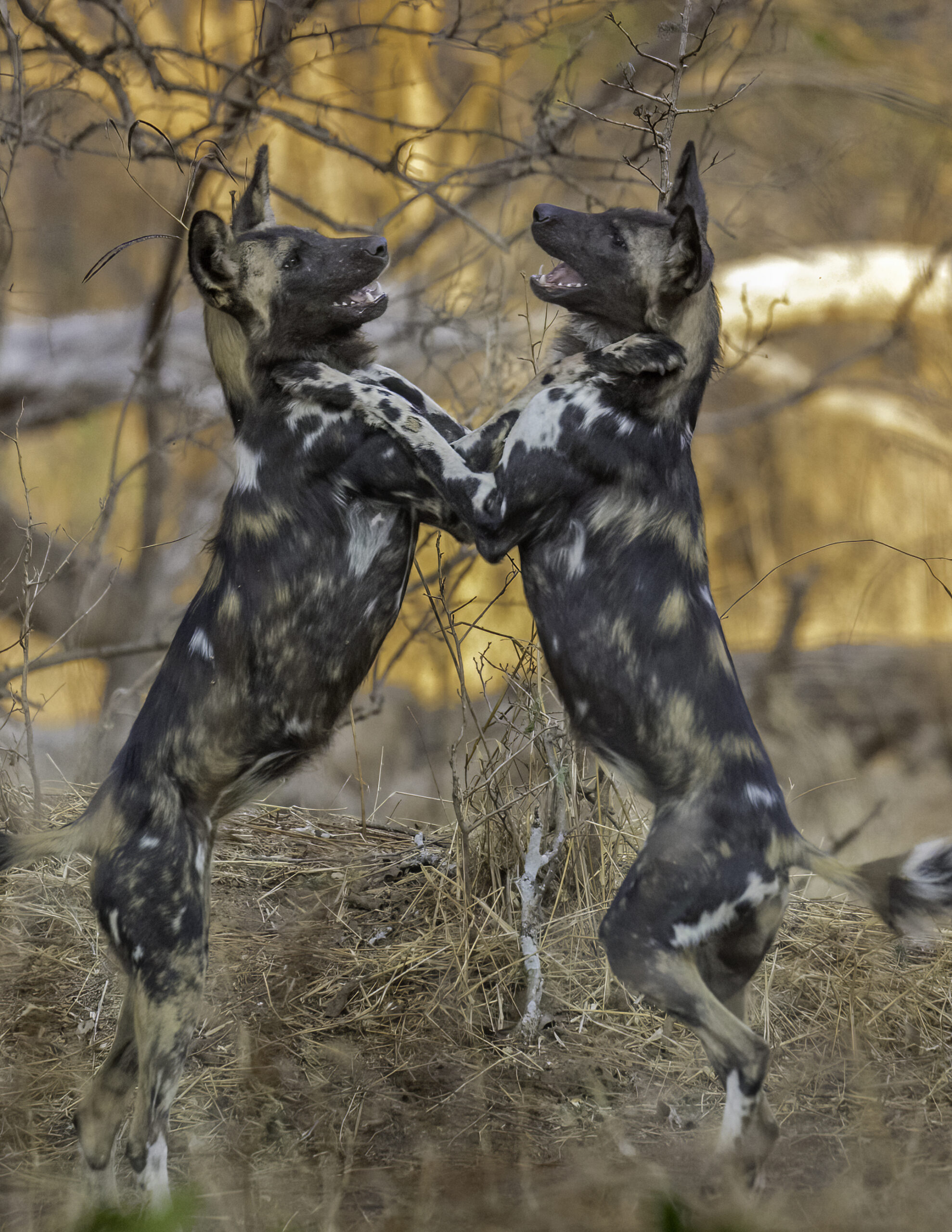 Wild dogs are my favourite animal to see on safari. One of my most memorable encounters was in Zimbabwe’s Mana Pools National Park, when late one afternoon we sat, silently watching a pack of sixteen wild dogs. They lay napping in a shady depression, camouflaged by their mottled coats. The air was warm and still. The only sound to be heard was a distant bird call. Aside from the occasional flick of a tail, the pack lay inert. We were transfixed. The sun sank lower in the sky. One by one the dogs woke, yawned and stretched. Getting to their feet, the pack members exchanged elaborate greetings… whimpering as they sniffed, smelt and licked one another. Gradually the dogs became livelier; prancing and playing. There was a definite light-hearted atmosphere amongst the pack as they gambolled together, waiting for the last few deep sleepers to stir. Playtime over it was time to get to work, and the pack readied themselves for the night’s hunt, before disappearing off into the setting sun.