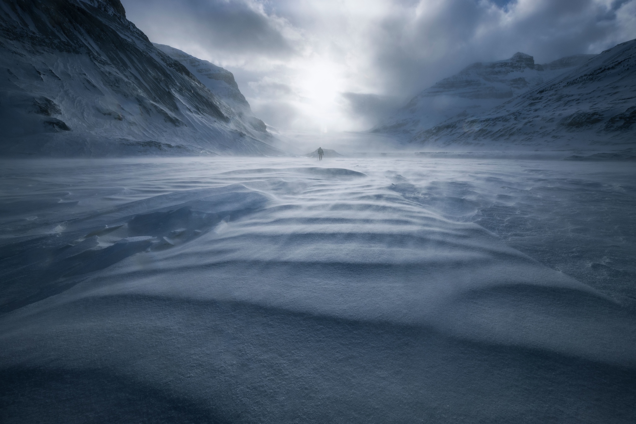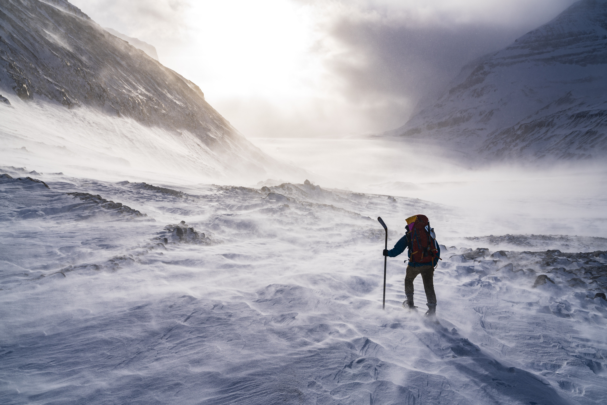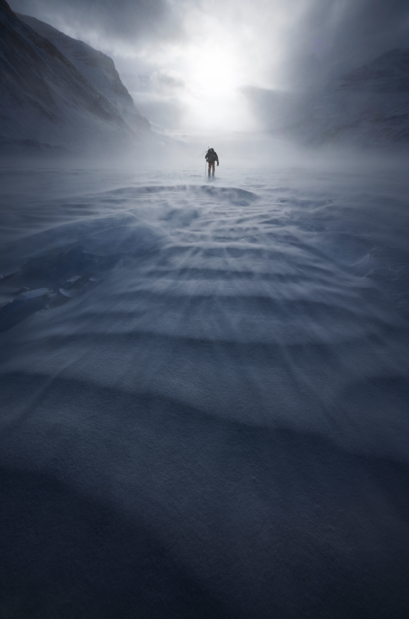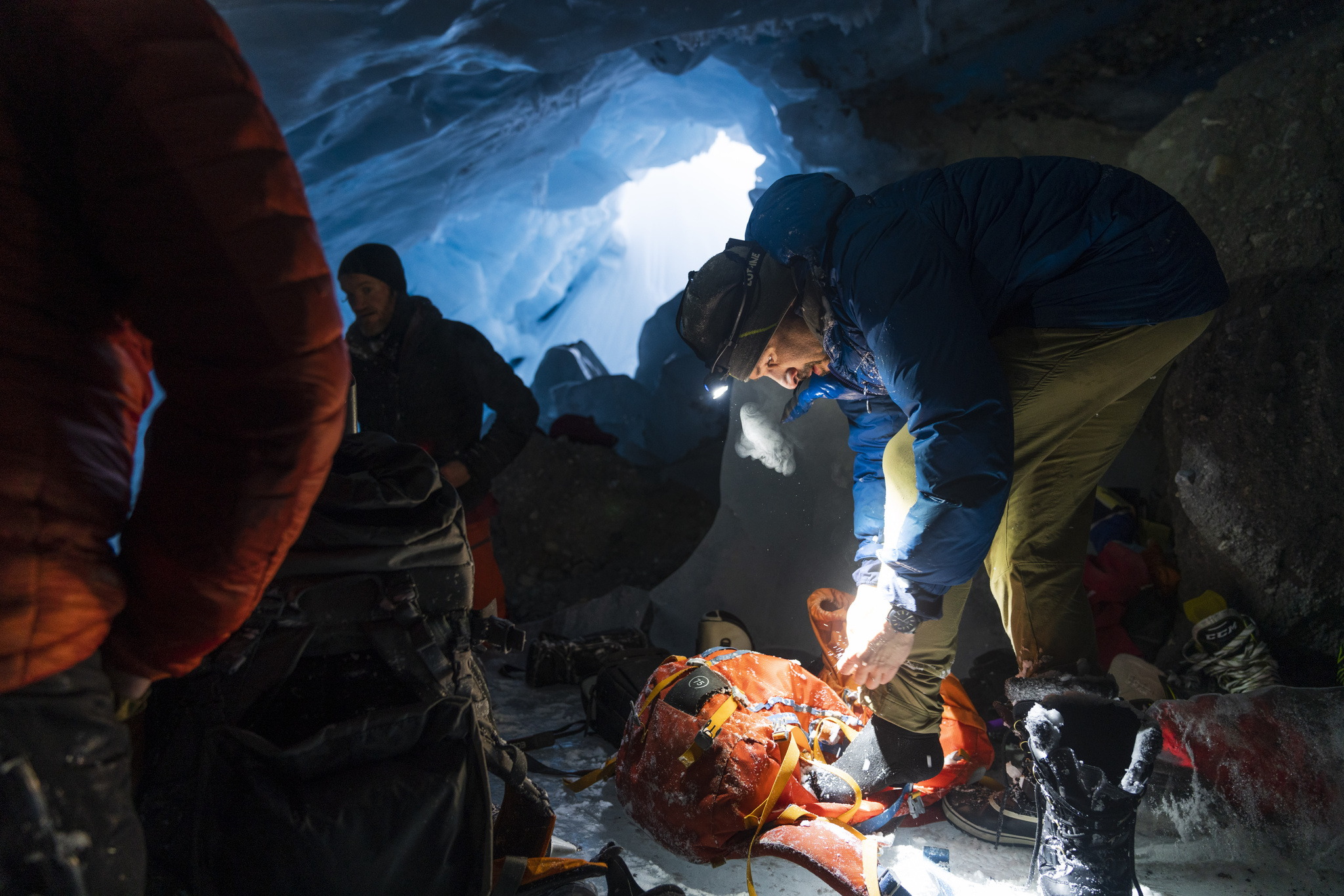 The approach to the ice cave is a strenuous 10 km hike from the road. The wind was incredibly strong that day, with headwinds of 100km/h which made for an adventurous approach. A beautiful by-product of the persistent wind was the blowing snow diffusing the soft winter sun. The conditions created a magical winter light that Paul managed to capture perfectly.