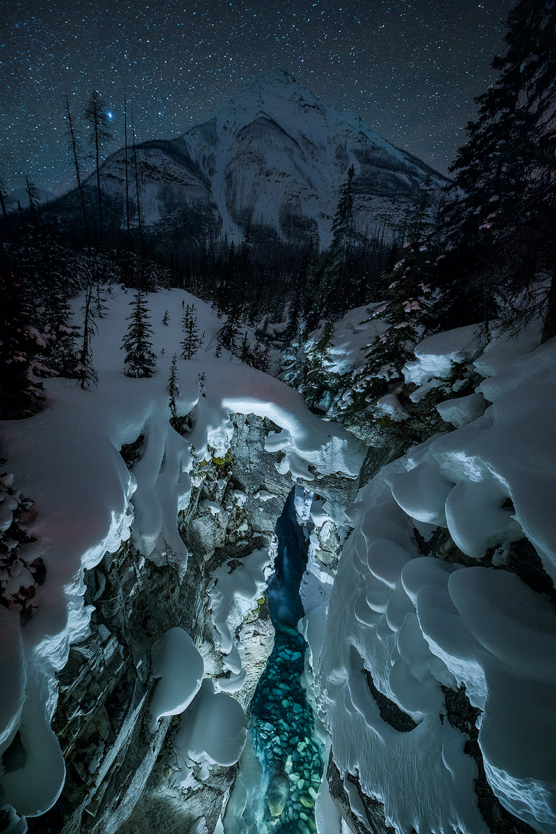 Paul Zizka is known far and wide for his night photography. Our second location was Marble Canyon in Kootenay National Park which neighbors Banff National Park. The polar vortex was a blessing in disguise. Though it was -35 before the wind chill, the vortex made for clear skies and incredibly crisp stars.