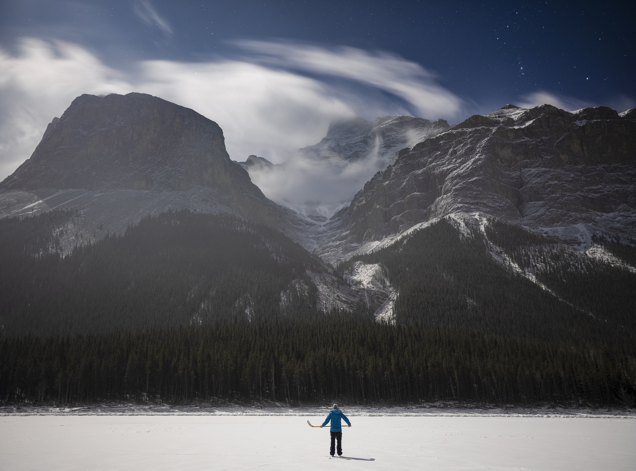 Paul Zizka has a tradition of skating across Banff National Park’s largest lake, Lake Minnewanka. Every winter, the 25-kilometer long lake freezes over, granting rare access to Banff’s backcountry wilderness. Skating is the preferred mode of transportation to reach the far end.