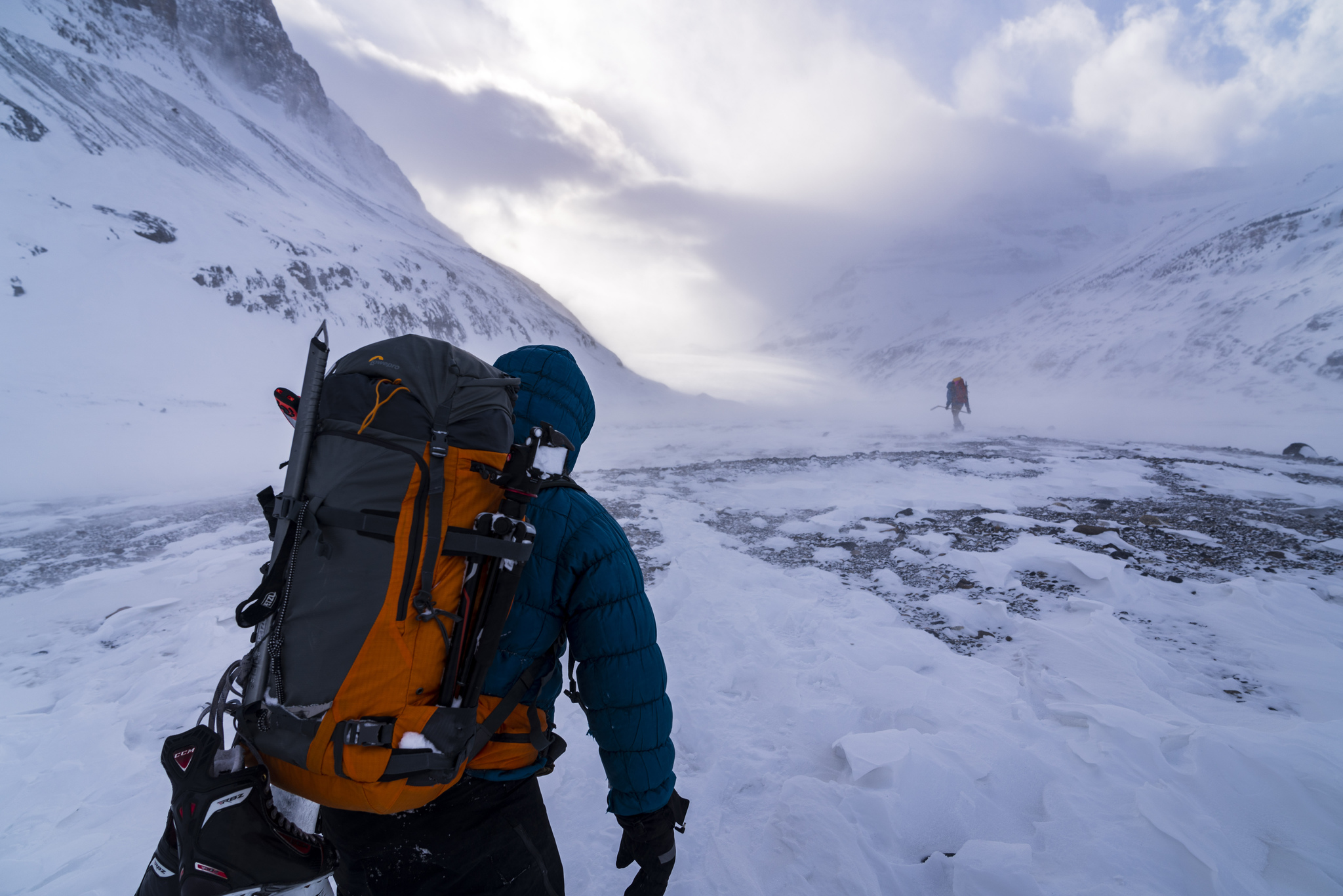 On the 25 kilometer journey back to our vehicles, the full moon finally peeked out from behind the clouds. The snow briefly stopped falling just long enough for Paul to take a beautiful self-portrait in front of Mount Inglismaldie.