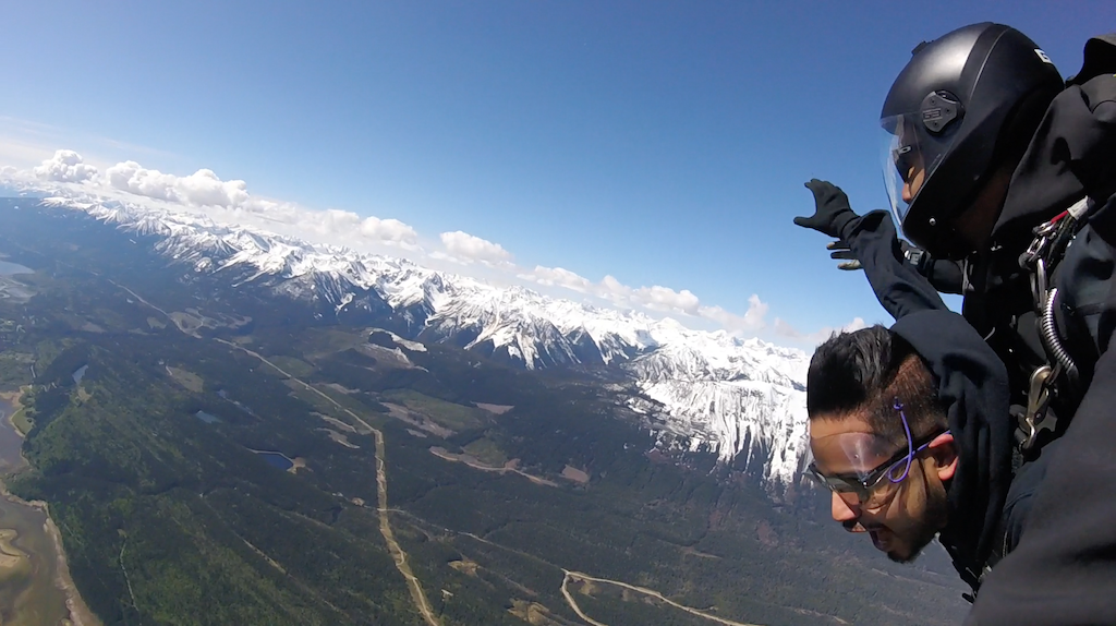 When the parachute deployed, we were no longer falling, but flying. I could see towards the national parks of Banff, Yoho, Glacier, Jasper and Kootenay. I could see the warehouse-like building of Whitetooth Brewing Company. I could pick out Golden’s main street with shops like Bacchus Books and Cafe, and I could see the Kicking Horse Pedestrian Bridge.