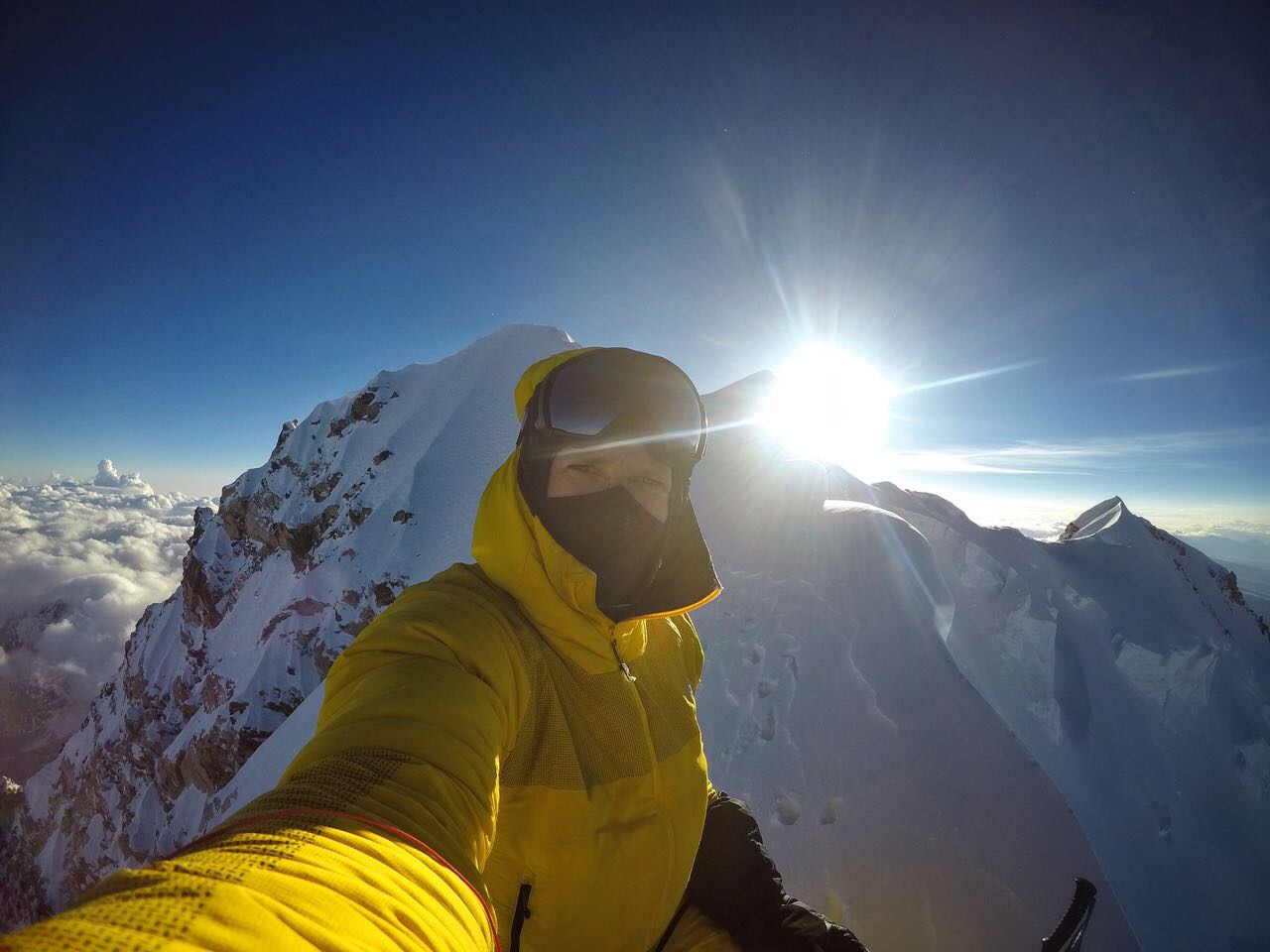 The pair started at 4:45 in the morning from the bergschrund (roughly 5,900 meters), carrying only a stove, food, a single sleeping bag, and a bivy tent.