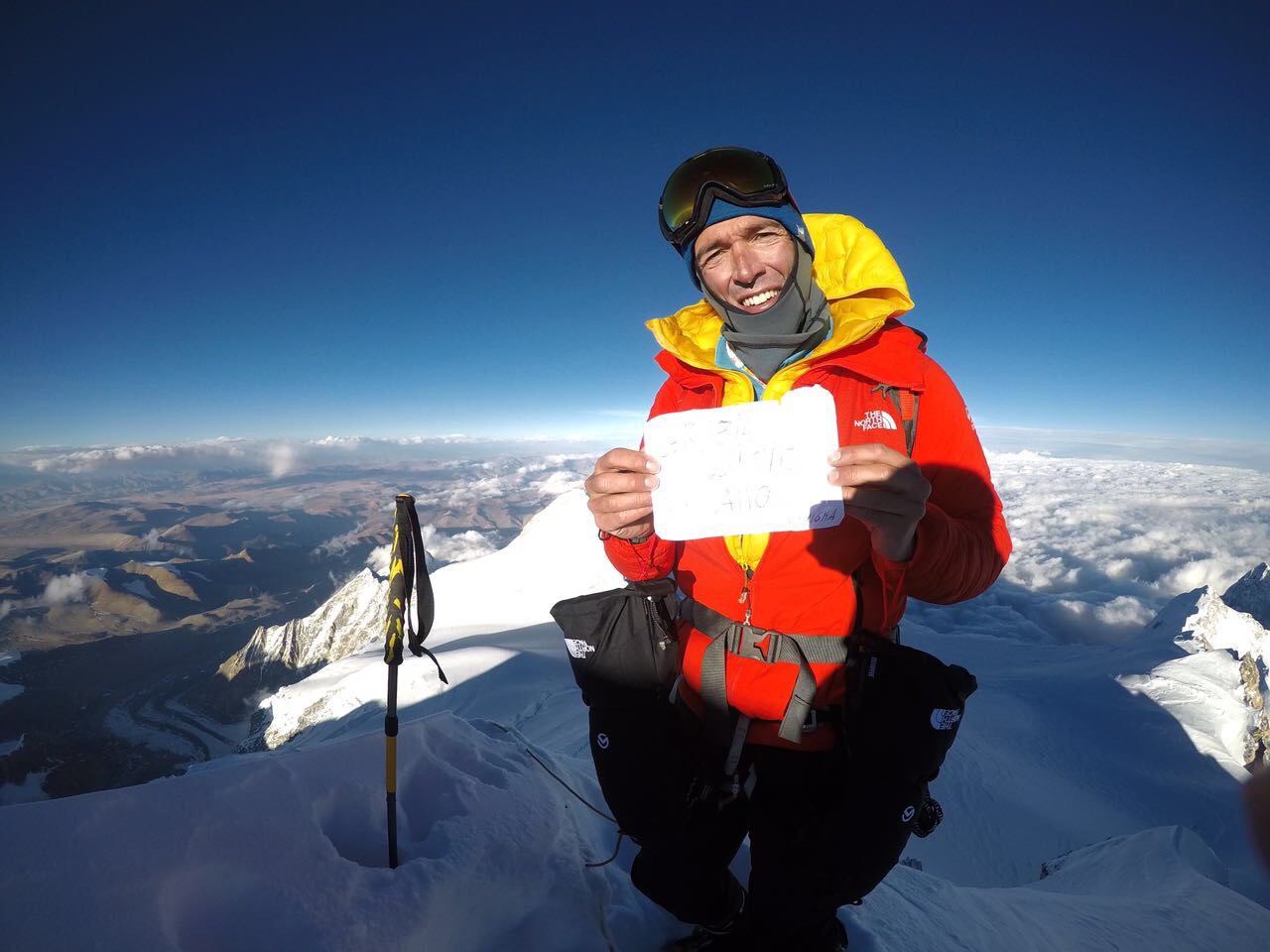 From the vantage point just below the top, they enjoyed a crisp view into Tibet, the clouds far below them. After taking in the moment and thinking of their friend Ueli, they climbed back down to their stash at 7,400 meters and spent a chilly night on the mountain before downclimbing the rest of the route the following morning.