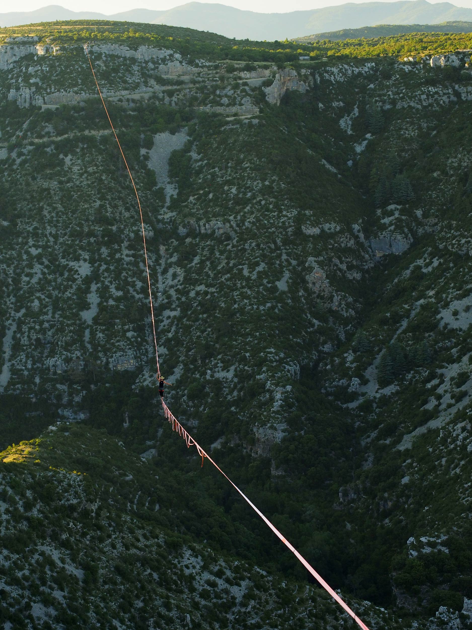 The original plan called for a 1.4 kilometer line, but then the team got wind of another highliner who was going to attempt a 1.6 kilometer highline. Not to be outdone, SDD went bigger, and settled on the spot in Cirque de Navacelles that would result in their 1,662 meter walks.