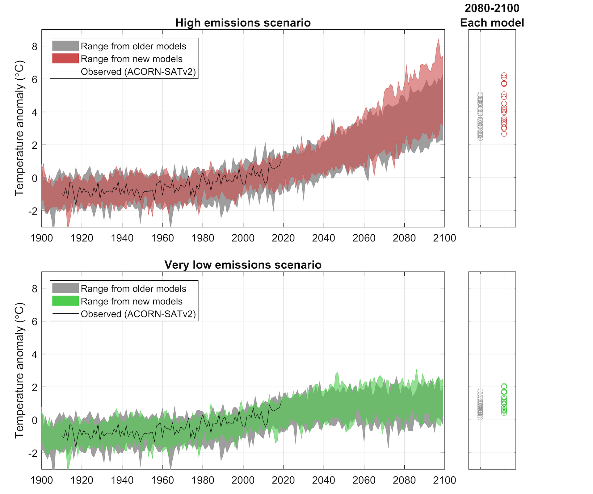 The previous generation of models (CMIP5) had equilibrium climate sensitivity values between 2.1℃ to 4.7℃ global temperature change. The values for the latest models (CMIP6) are from 1.8℃ to 5.6℃. This includes a cluster of models with sensitivity of 5℃ or more, a group of models within the previous range, and two models with very low values at around 2℃.