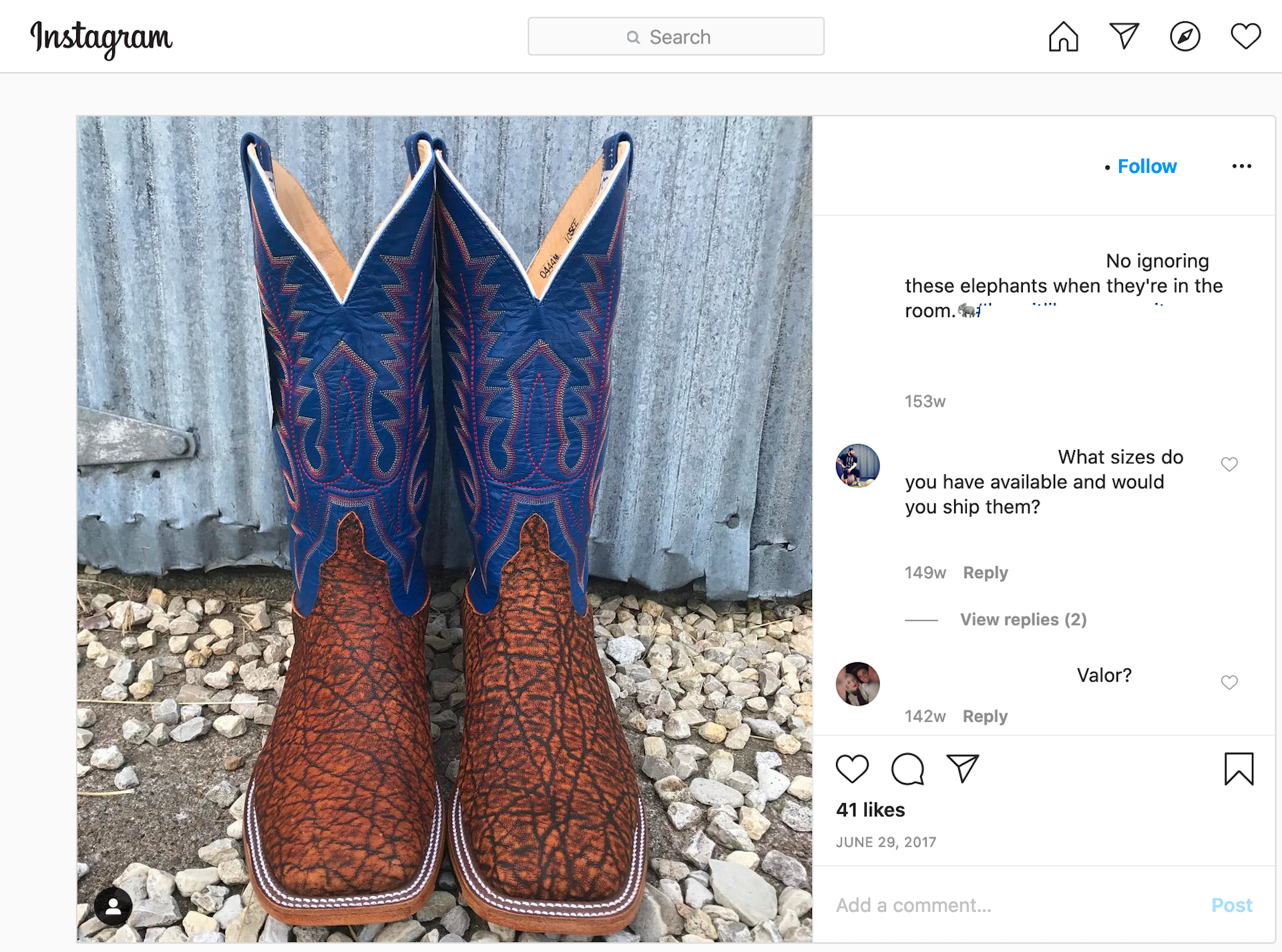 Performing a quick online search, we identified more than 30 retailers selling elephant leather products in the United States, mainly exotic boots. Their ads promote virility — “Just a hard-working, tough as nails, pair of American made cowboy boots” — and promise that others will be impressed, with messages like “No ignoring these elephants when they’re in the room.”