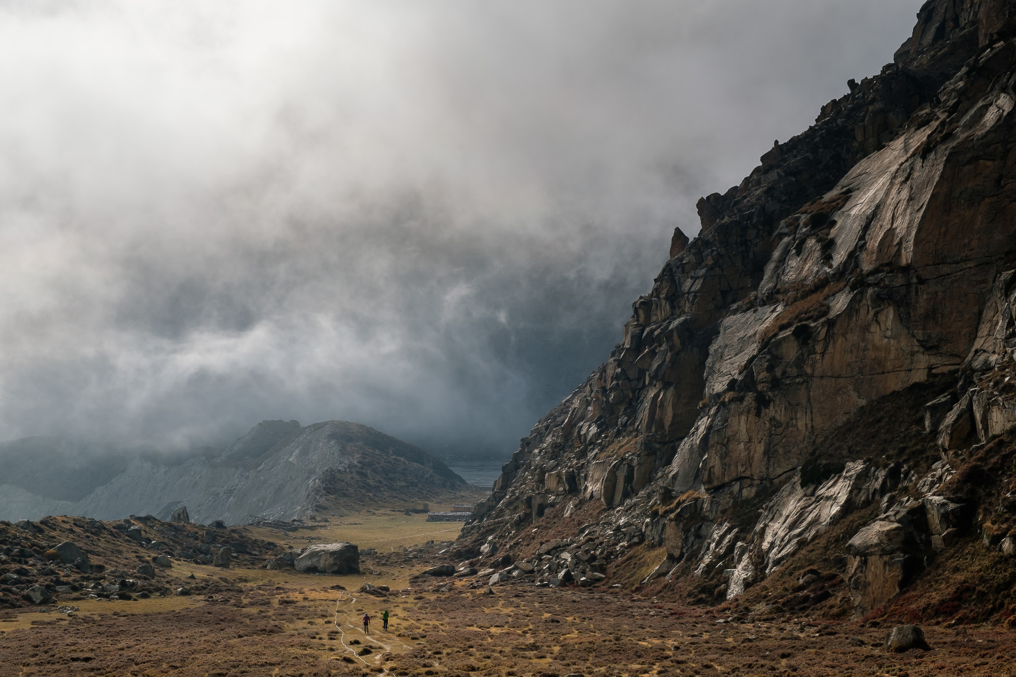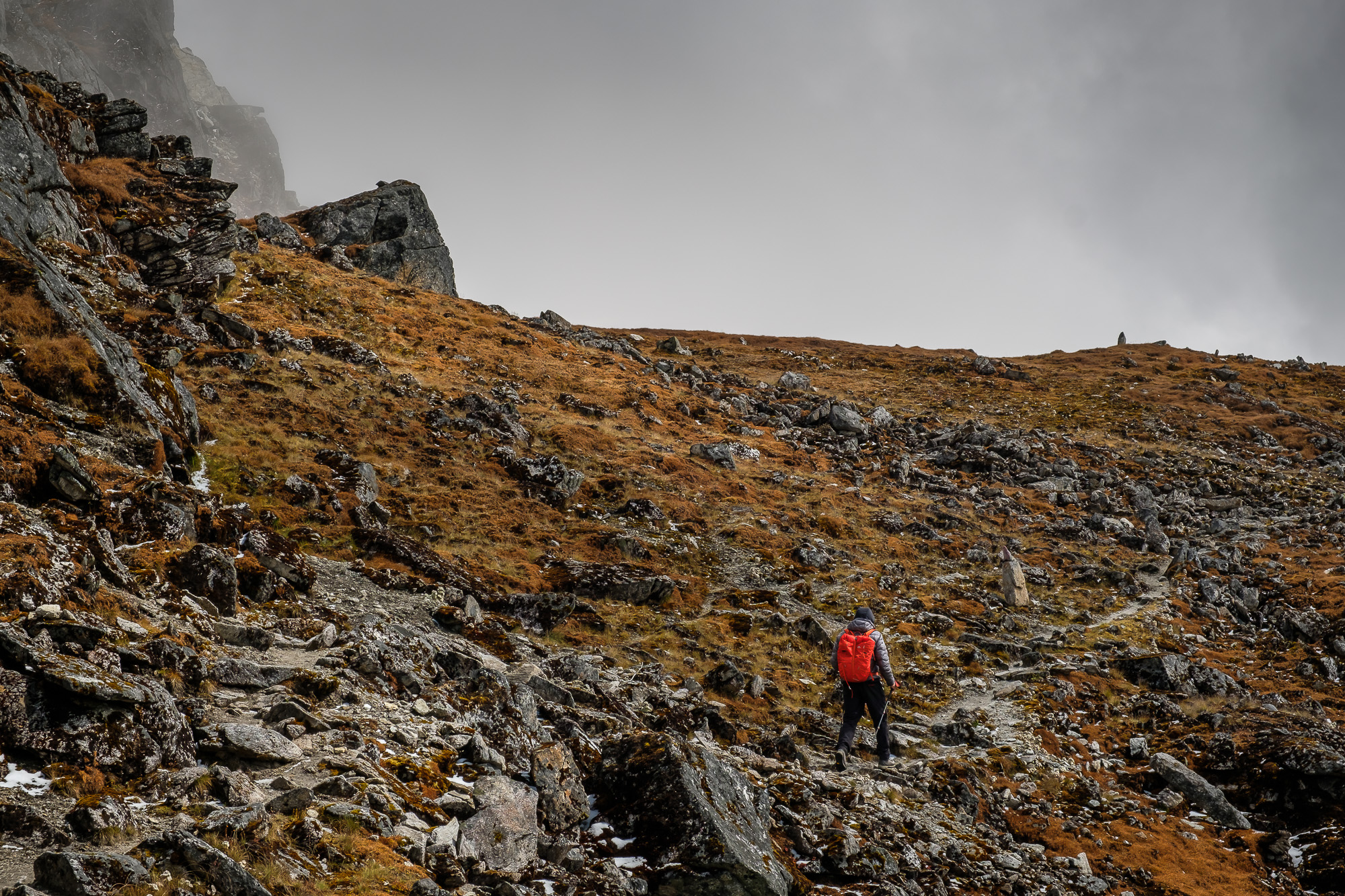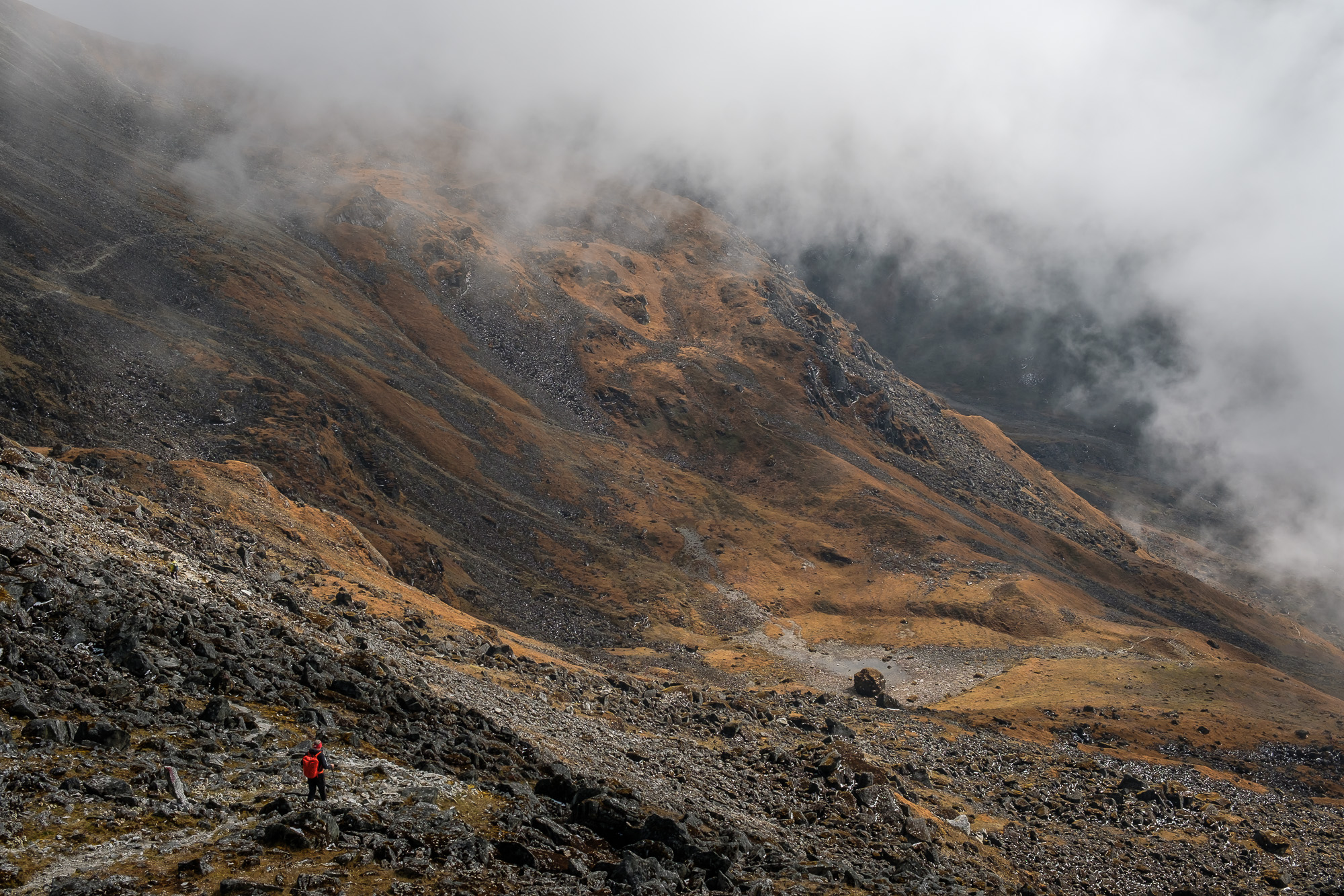 My favorite day was crossing from Ghunsa to Tseram. The route had three mountain passes, each over 4500m. We were moving in a group of five. We passed an ice-covered wall and a couple of crystal clear lakes. There was fog. In some places, the snow was falling softly on black boulders. This was a fantasy landscape, and I thought of Ged from Earthsea, Gandalf, and the Faerie. This was the place where you dream, and I also thought of the problem with my Antarctic’s gaping absence. Mariev spoke of skyrunning, and mentioned random landforms: nunatak, bergschrund, rantcluft. He chattered in his friendly manner and appeared as gigantic as he did on the day I saw him and Dusharin first -- for some people, there is no gap between who they are and how they present themselves to the world.