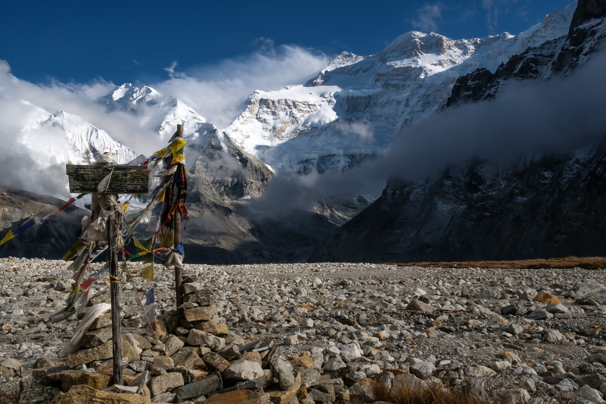 We climbed a couple of meters up. Mariev stopped. I straightened up and looked around. Kanchenjunga was right in front of us. The clouds, wreathing, moving, were below. White, silver, ochre, and blue. The reality was intoxicating and crisp. ‘Wow’, I said. Mariev’s face lit up, and he said: ‘S goroi’. ‘Congratulations with the mountain’. And just like that, I understood.