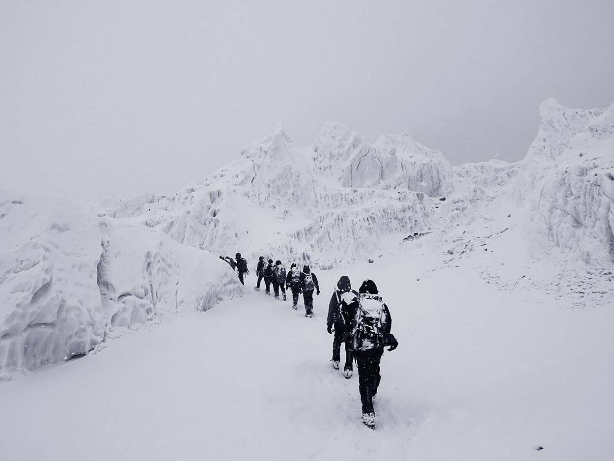 At first, it was cold and to most of us who were drenched it felt like deep winter—but within a few minutes the butane gas stove was choking us and we had to crank it down. I put my rucksack down on the floor with my climbing gear propped between my legs and my down jacket on the backside. I had a makeshift pillow. I tried to sleep.