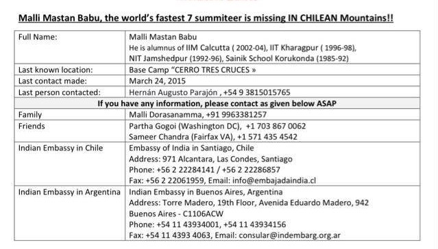Srinija, a New York-based software consultant and one of Babu’s college friends told The Outdoor Journal, “Time is running out. Babu has been missing since 24th March, and weather conditions have been rather poor for a search on foot. We had contacts in Argentina and managed to arrange for a private helicopter thanks to the tremendous support from Babu’s friends and family.”