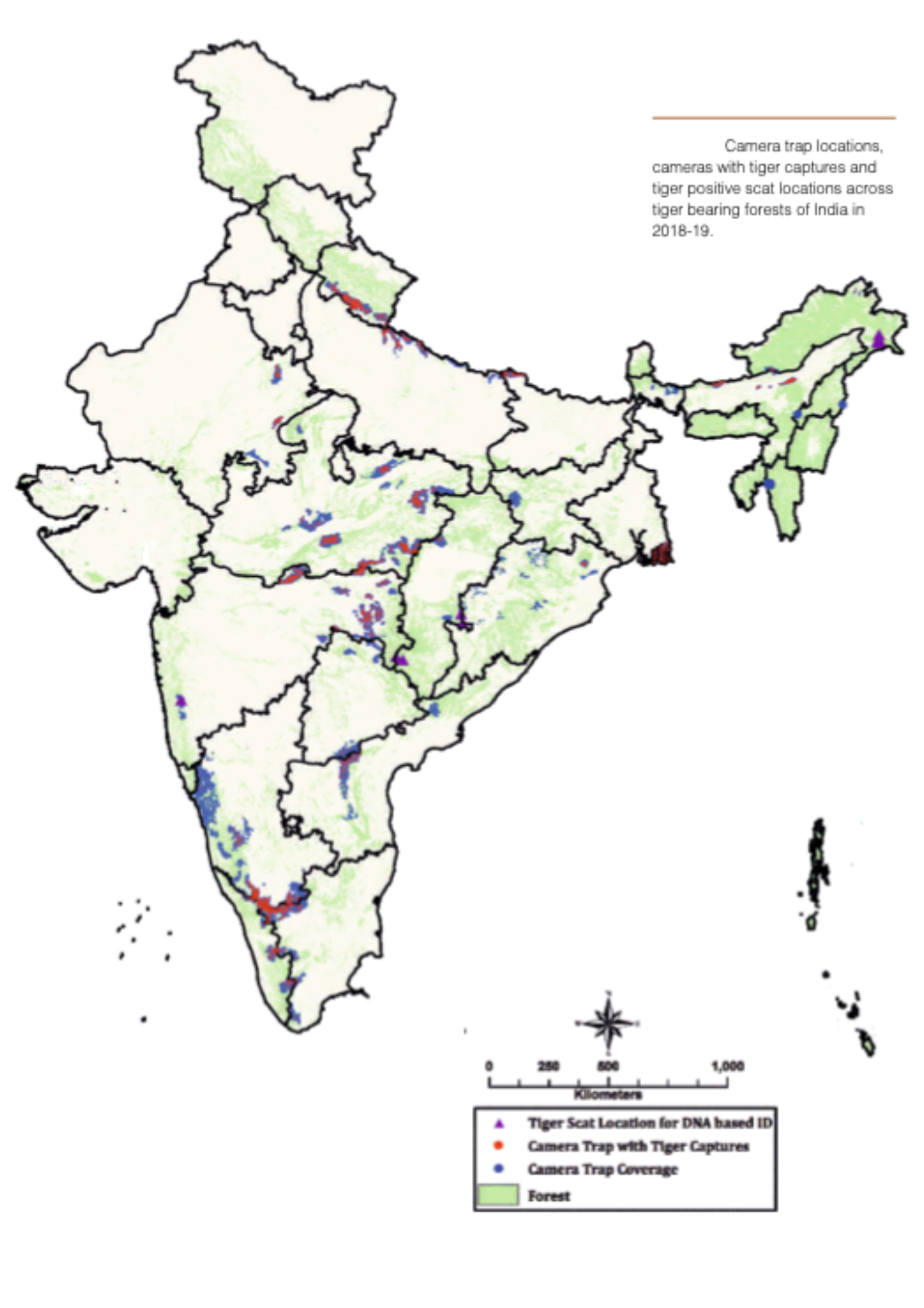 After that, Phase 3 commences and camera traps are placed strategically in the sampling area to maximize the possibility of photo capturing tigers and leopards. The cameras are put in pairs to capture both sides of the carnivore each of which have a unique pattern of stripes or rosettes. According to the report, camera traps were placed at 26,880 locations for mark recapture analysis. Scat samples were collected for genetic sampling simultaneously in areas where camera trapping was not feasible.