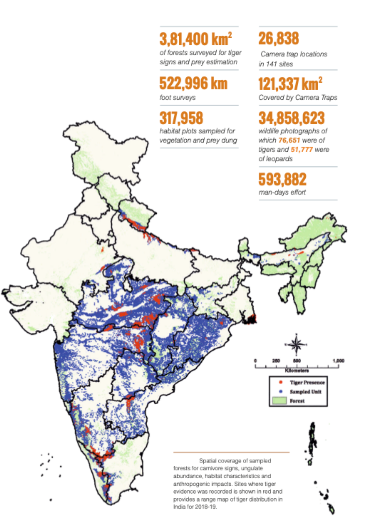 In total, the camera traps captured 34,858,623 photographs of wildlife. The total number of individual tigers camera trapped are 2,461 and it has been estimated that the total tiger population of India as of 2018-19 is 2,967 which proves that the wild tiger population has increased.