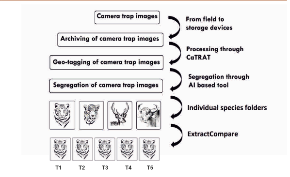 Technology has been well utilised for this survey. An image processing software called CaTRAT was designed to organise and geo-tag the photo-capture. These were further classified using an AI image processing tool into species. Pattern recognition programs called ExtractCompare and HotSpotter were further used to identify individual tigers and leopards, respectively. Using SECR (a likelihood based formula), the camera trap captures and ground survey data were used to estimate the tiger and leopard abundance in each landscape.