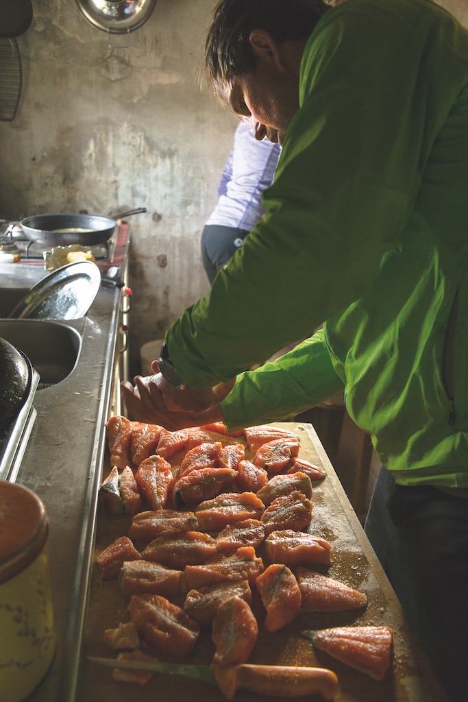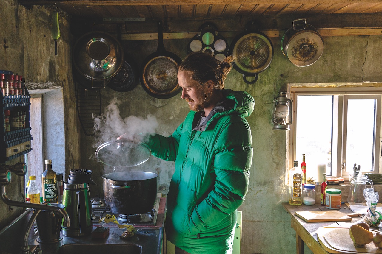 Spice racks and pots and pans hang on the exposed cement walls and an antique stove in the corner provides heat and constant hot water for tea, as well as a drying area for jackets, ski skins, and boots. Golden evening light filters through a small window facing the ocean. Keree Smith and Camilla Edwards, my co-chefs and friends, are very much at home in the kitchen, having both worked for a season at Kvíar as guides and cooks.