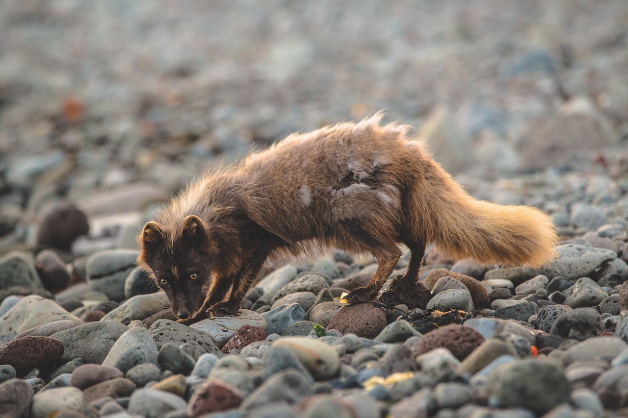 Though it’s nearly 10pm, sunset is just beginning. After the jam session, I walk down to the beach and watch two scruffy, burnt orange Arctic foxes scour the shoreline for dinner. As I wander between tide pools and seaweed-covered boulders, I hear an unfamiliar whooshing sound. Staring into the fading light, I see three whales swimming close to shore, the mist from their blowholes illuminated by the last light of day. Whale breaths sigh across the water, and I stand still, listening to their giant exhales and watching them glide across the fjord.