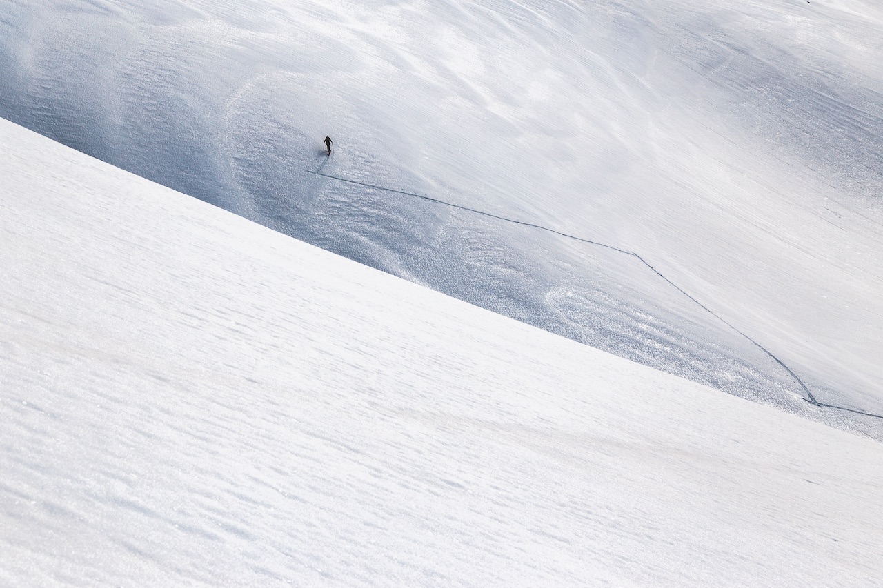 The week is a blur of incredible skiing, though the snow is melting fast. As we come to our last day, I think about past generations who skied across this landscape to trade with neighboring communities. Large cairns mark their routes, stacks of black volcanic boulders five feet high that can still be followed when the area’s famously thick fog descends and blocks out all visibility. We don’t follow them, as we’re seeking steep runs and interesting couloirs rather than the most direct routes between farmsteads. But these relics remind me of the dynamic state of the environment and its people.